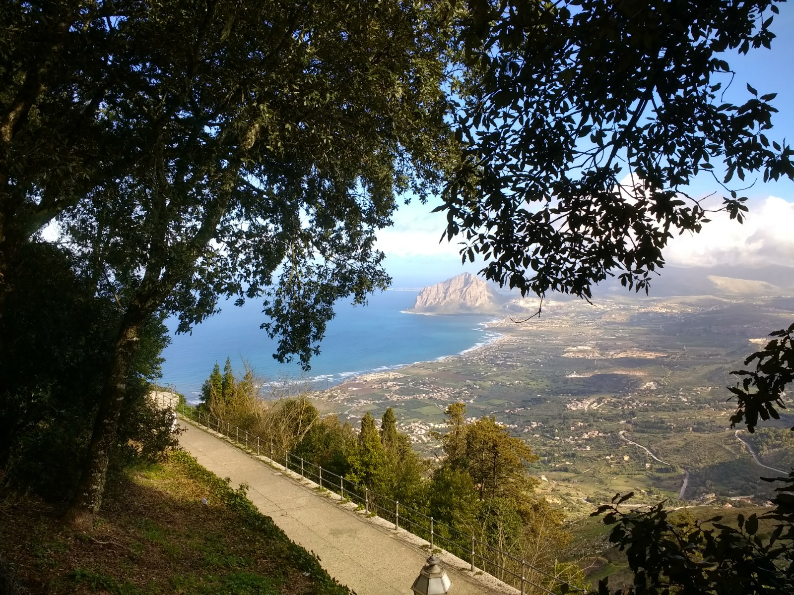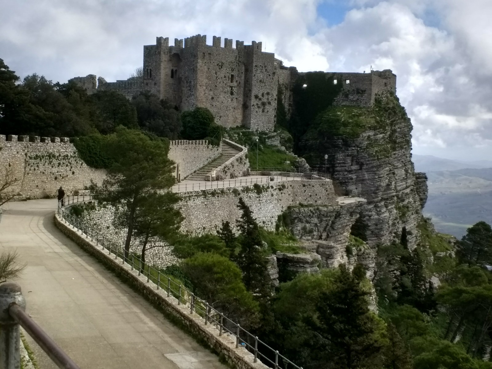 We had a view of the salt pans from Erice, a village perched on top of a lonely mountain, reached by following a long road of hairpin bends (there is a cable car, but it is closed at this time of year for maintenance).