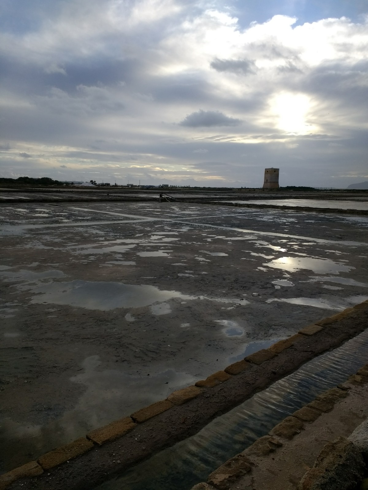 The wind here, which today is ‘fresh’ according to the BBC, but ‘brass monkeys’ in our parlance, is we learned at the Salt Museum yesterday, a constant feature all year round. People have harvested salt from the sea on the coastal plans between here and Marsala since the Phoenicians (800BC) and until recently this was all done by hand (during the hottest months of the year). High temperatures and wind are needed to vaporise the water.