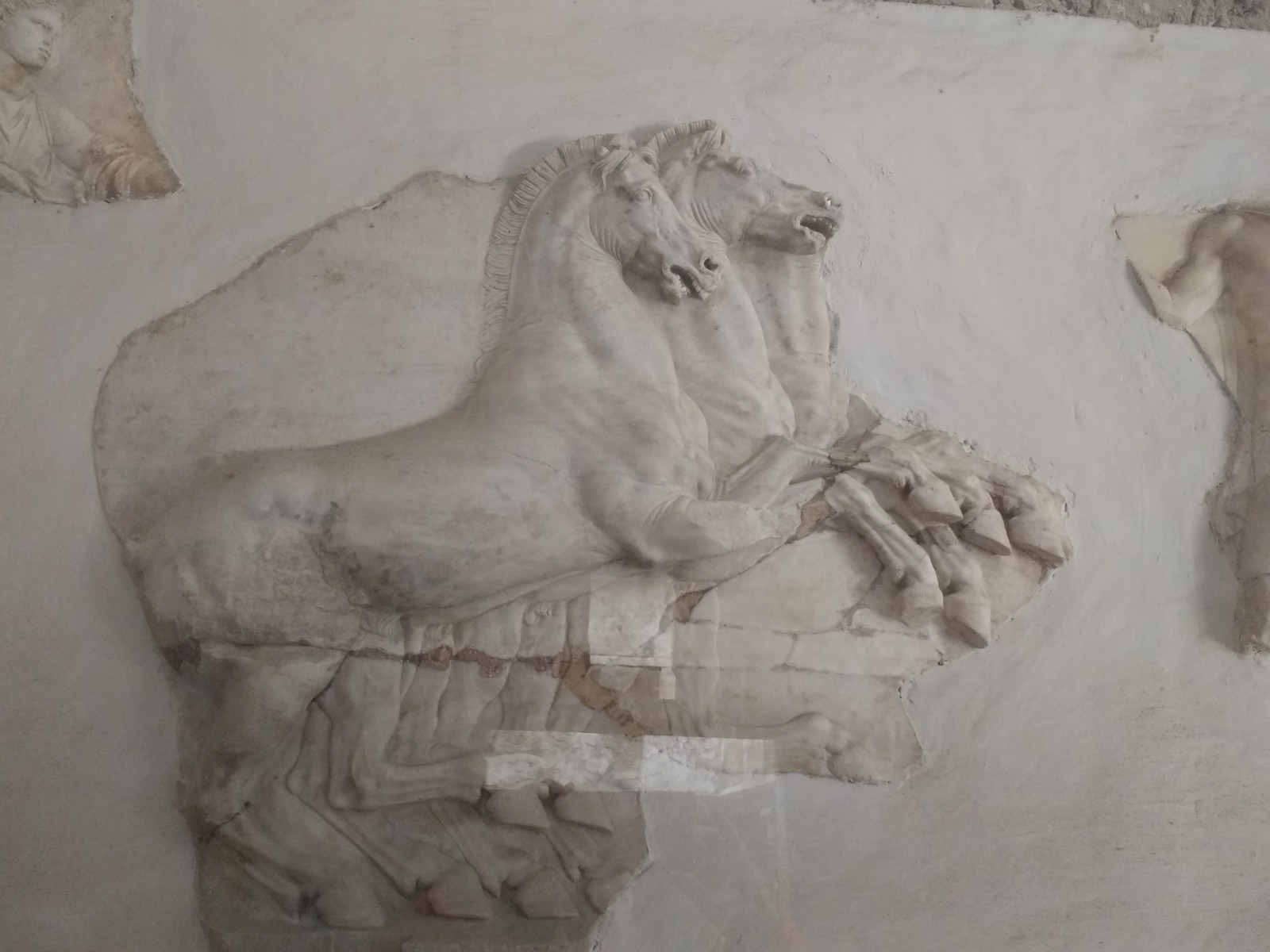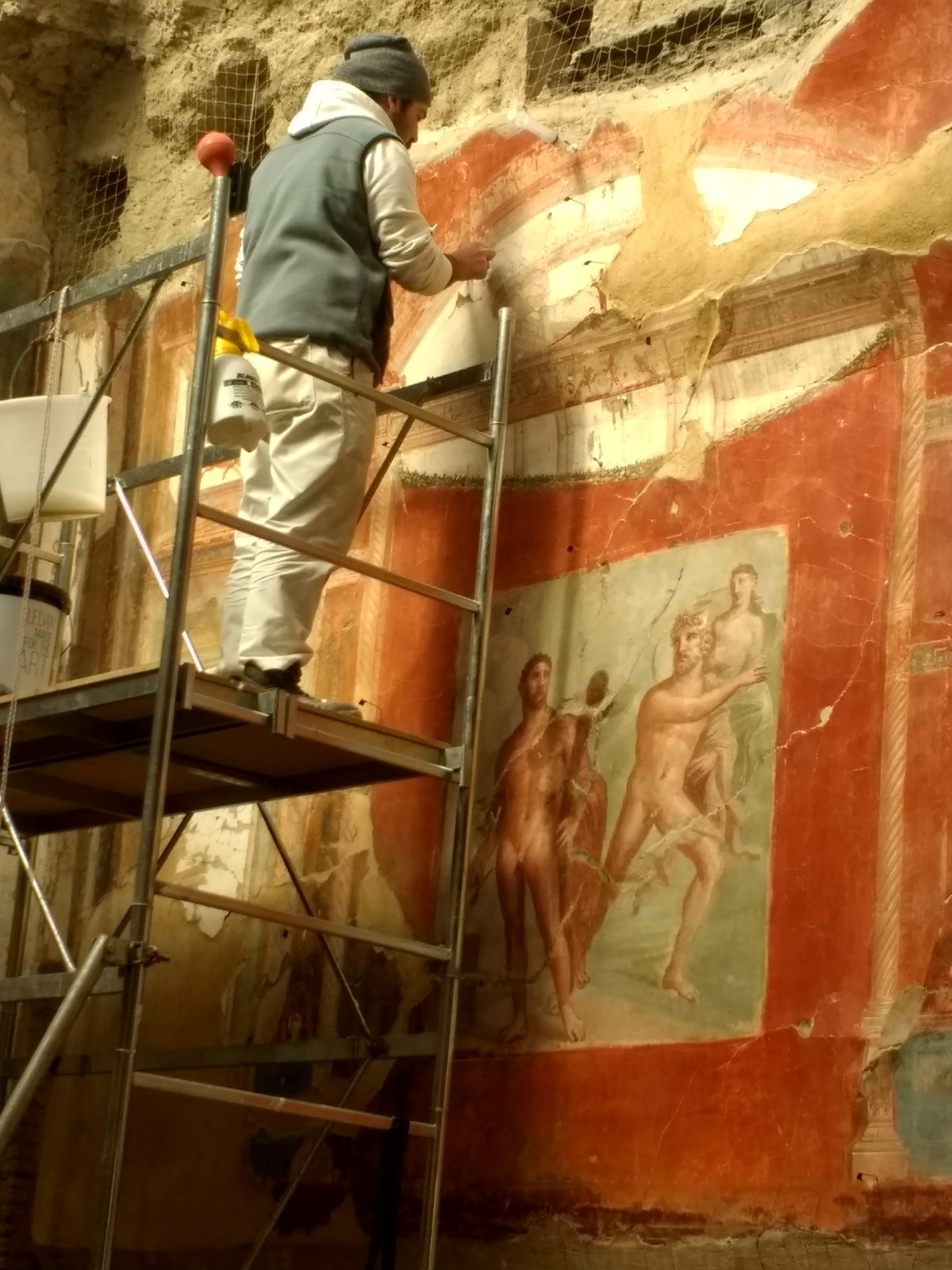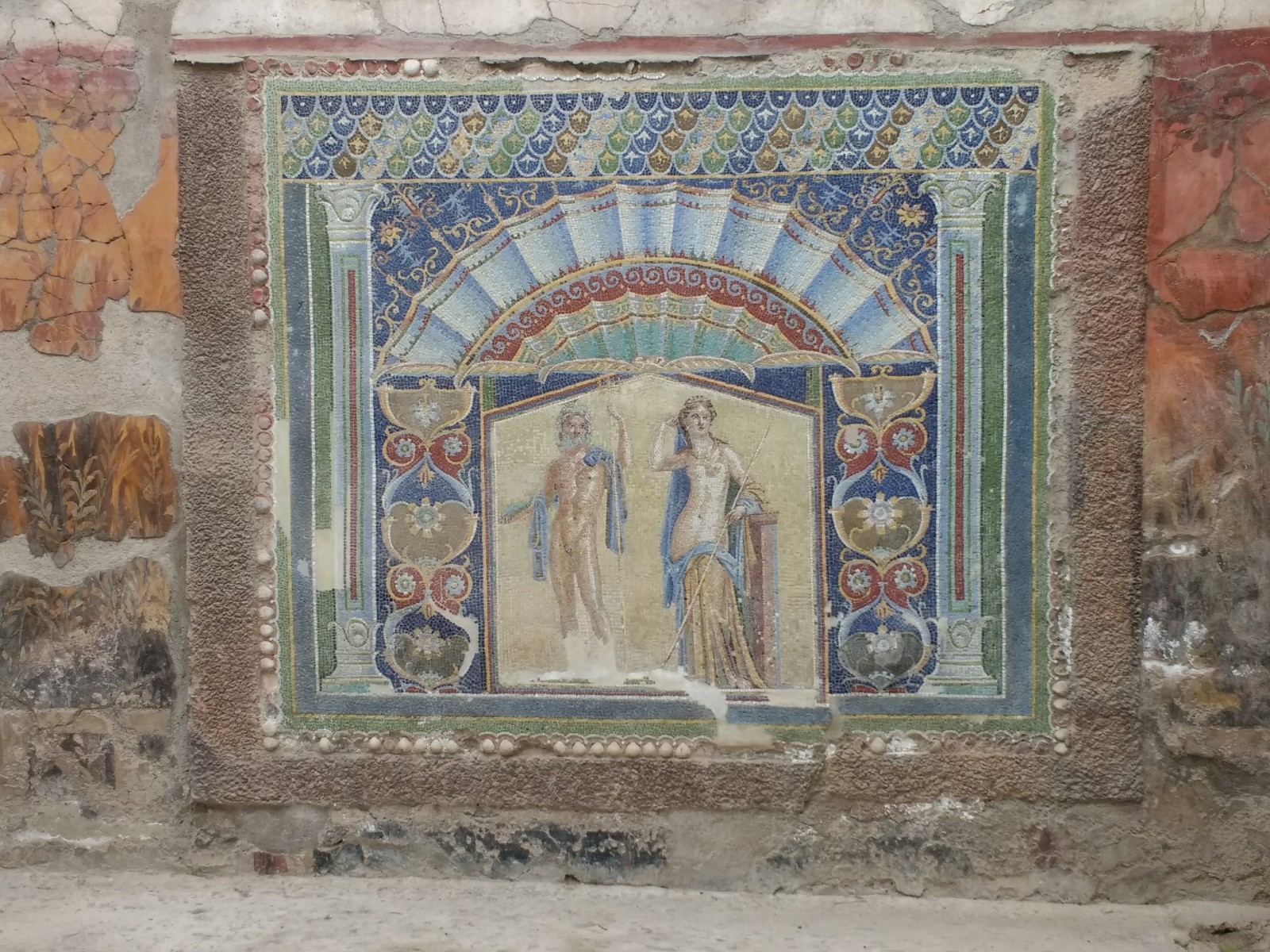 MosaicAnother mosaic Part of a friezeLadies’ changing room in the bath house. The niches on the walls are for the women to store their clothes.Mosaic in ladies’ bath houseThese wooden sliding doors, affording a little more privacy in the dining room, have survived, complete with brass handles.Conservation in progressBronze statue