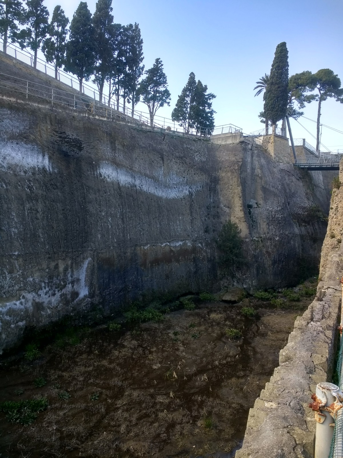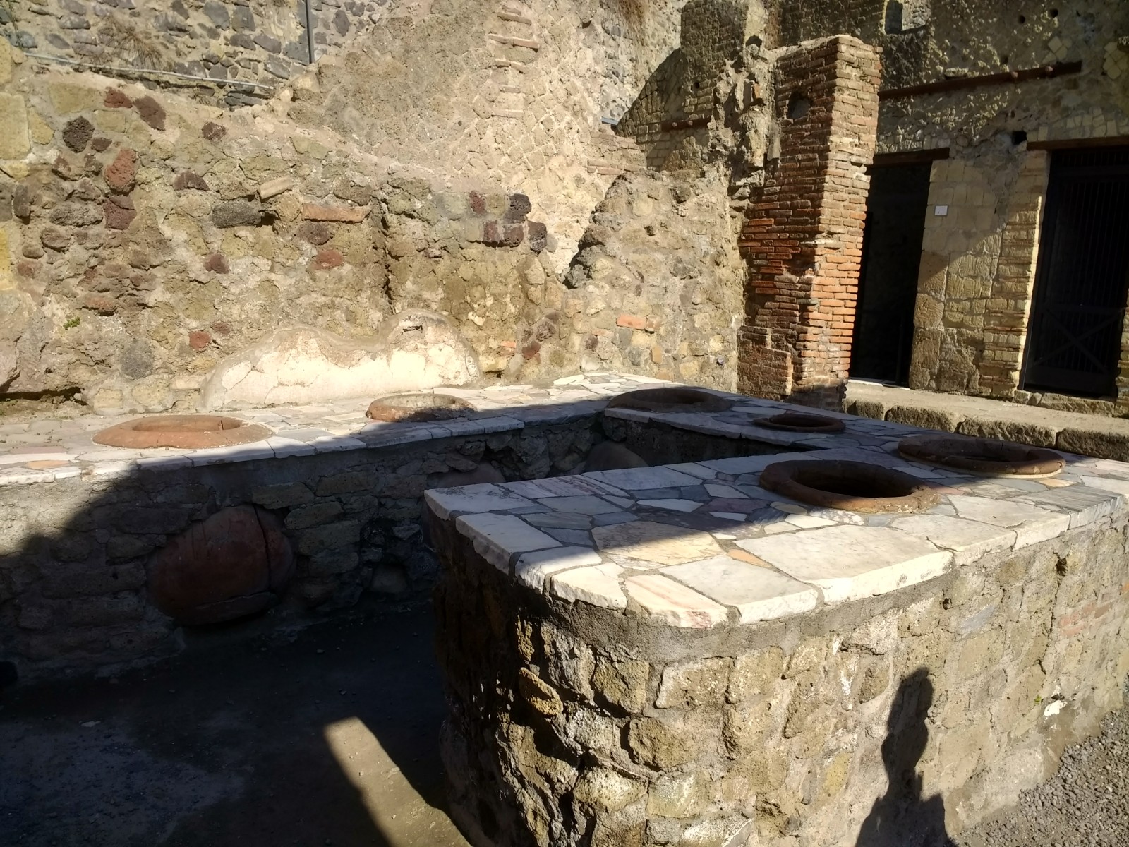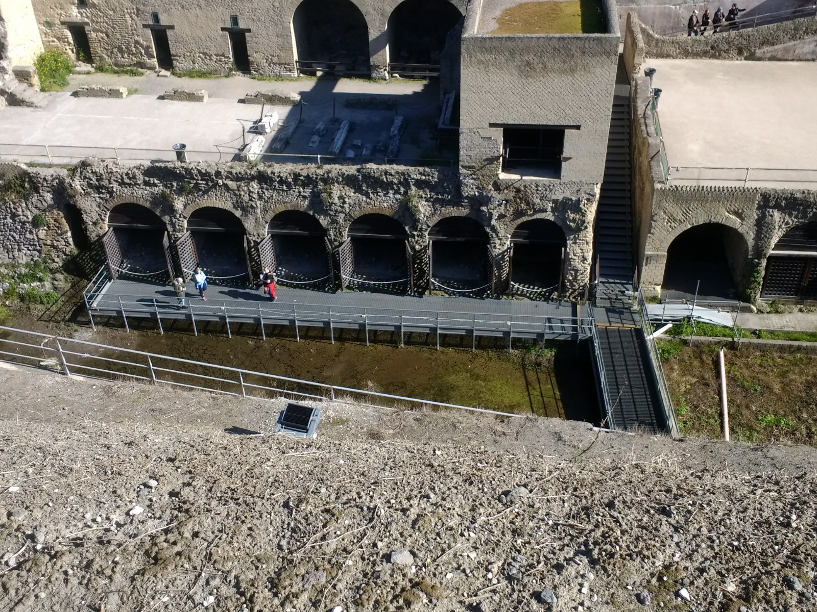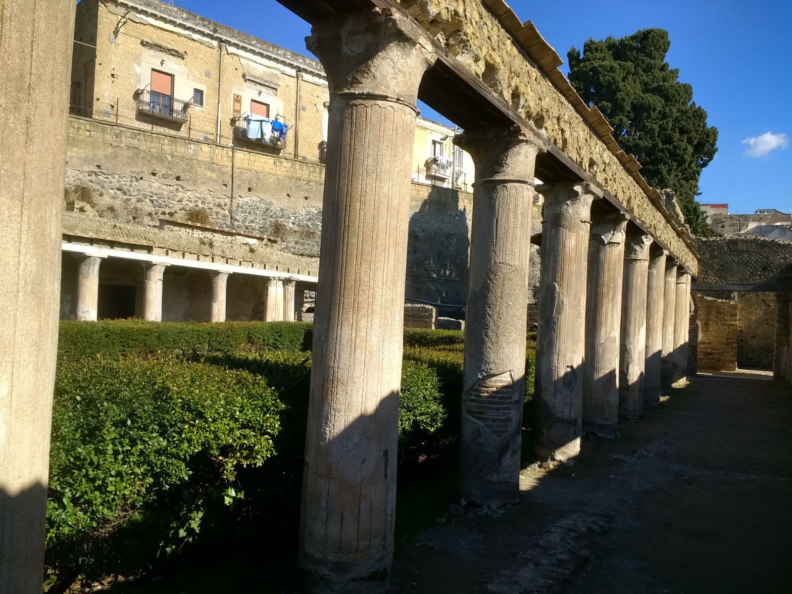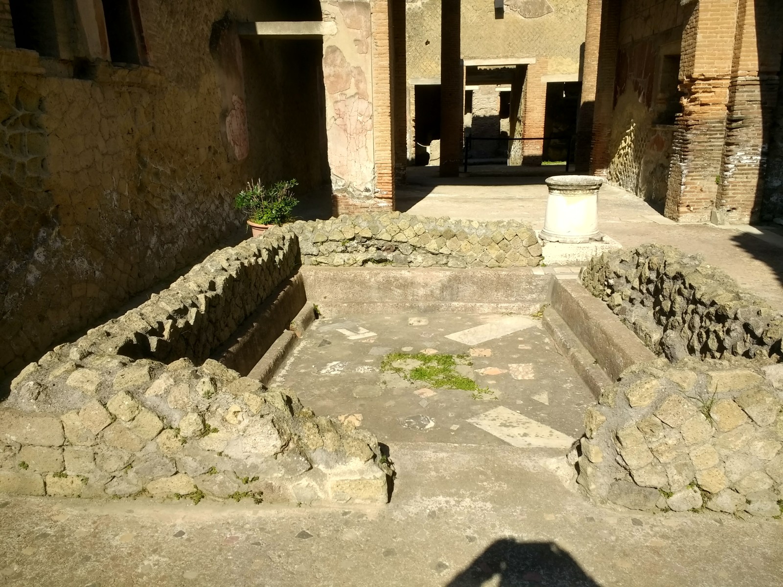 Garden in Herculaneum. The modern city is slap bang next to the ruins as is evident from the washing.Warehouses and ancient beach. Back in 79AD, Herculaneum was on the coast (It is now 500 metres away). In 1980 about 300 skeletons, of people attempting to save themselves from the disaster, were found in the warehouses. Most residents, though, did escape.House entrance Impluvium (rainwater pool). A lot of people In Herculaneum did not need an impluvium, though, as water was piped into their homes. Herculaneum was a more affluent town than Pompeii.