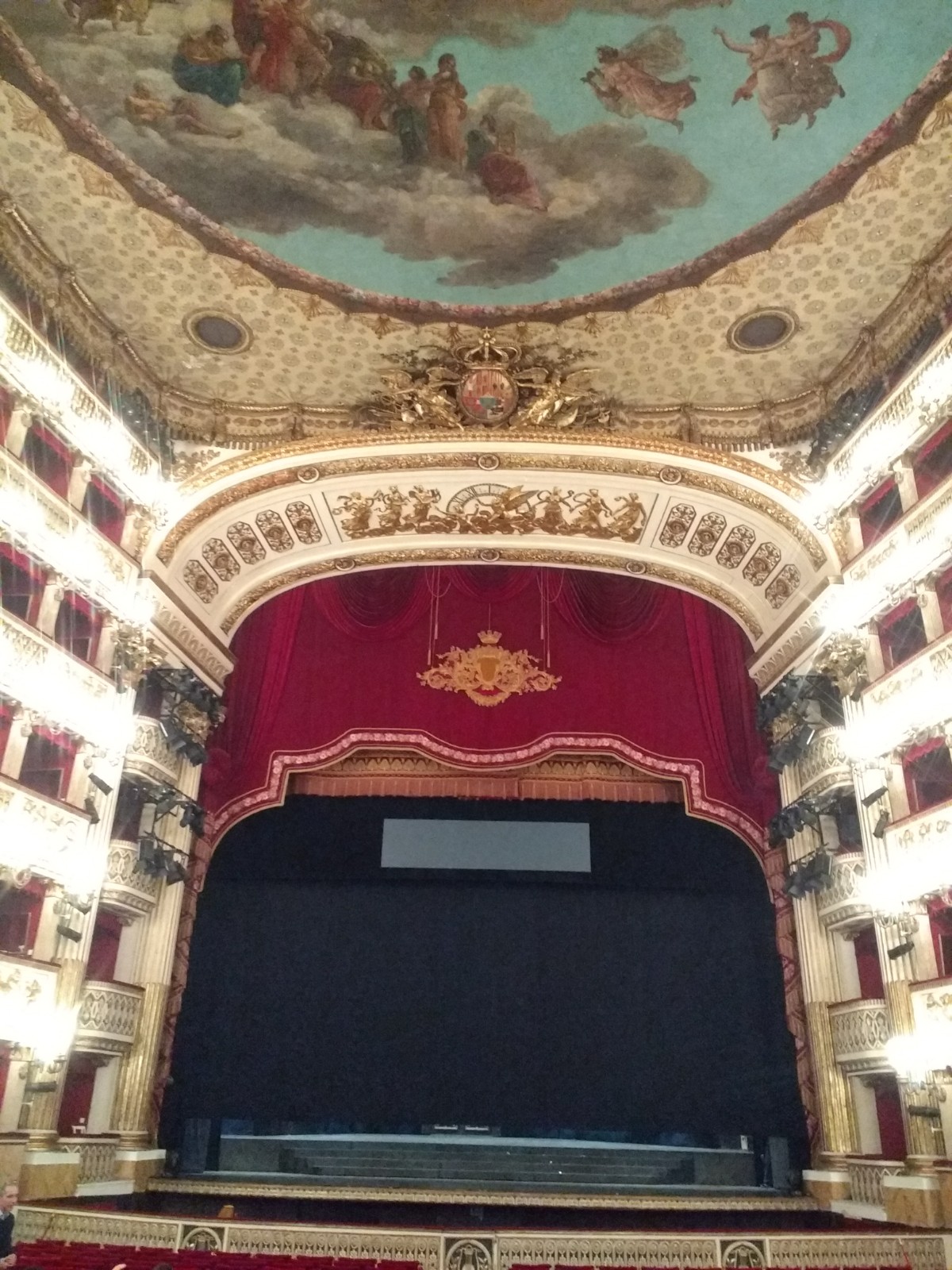 The theatre was commissioned by Charles III of Naples (the one who left to become King of Spain) in 1737, and was restored after a fire by his son, Ferdinand IV. Ferdinand, suspicious of the number ‘17’, had the numbering on the boxes he passed, on the way to his own, changed, to read, ‘15, 16, 16 bis (meaning for the second time) 18.