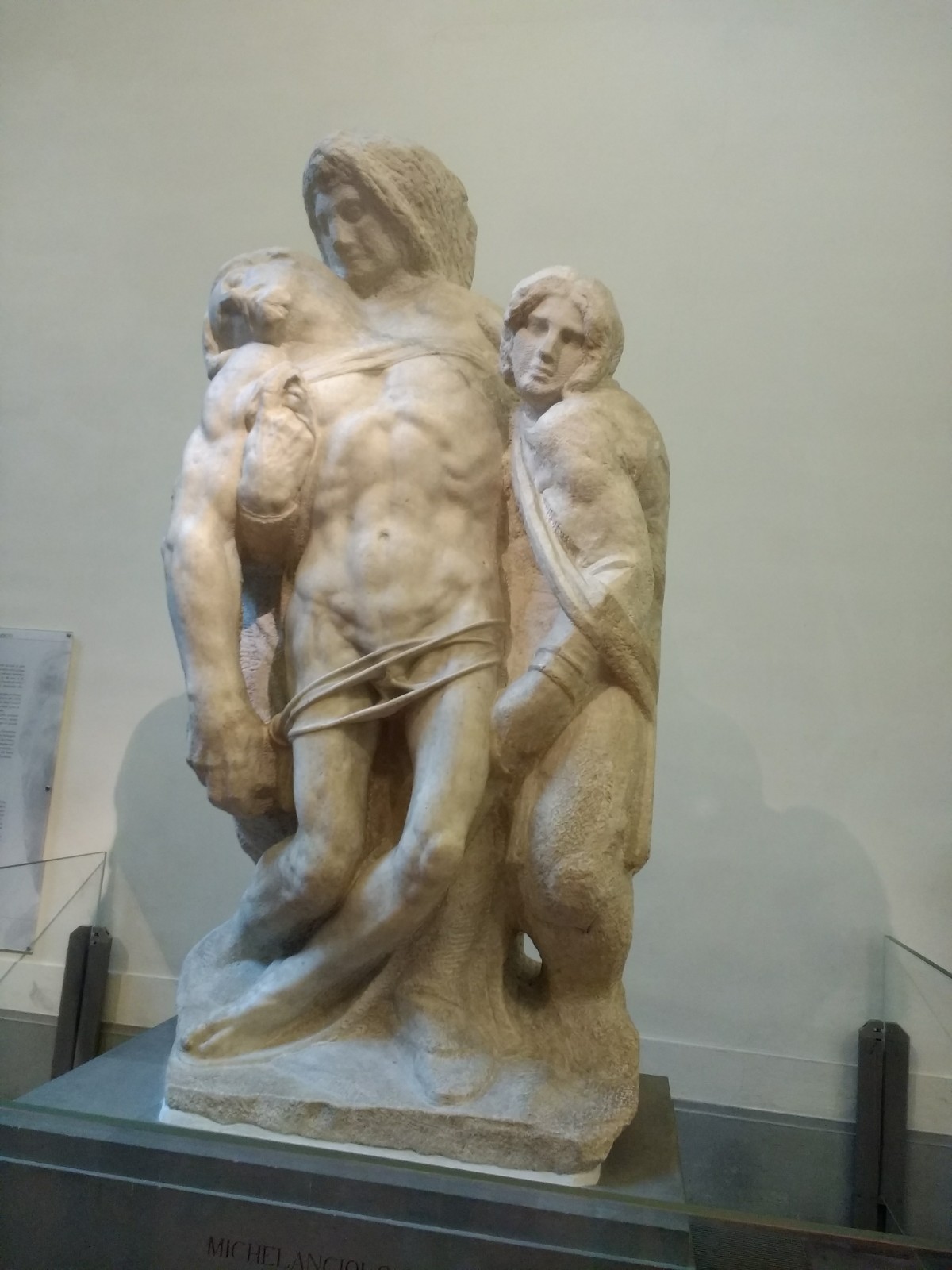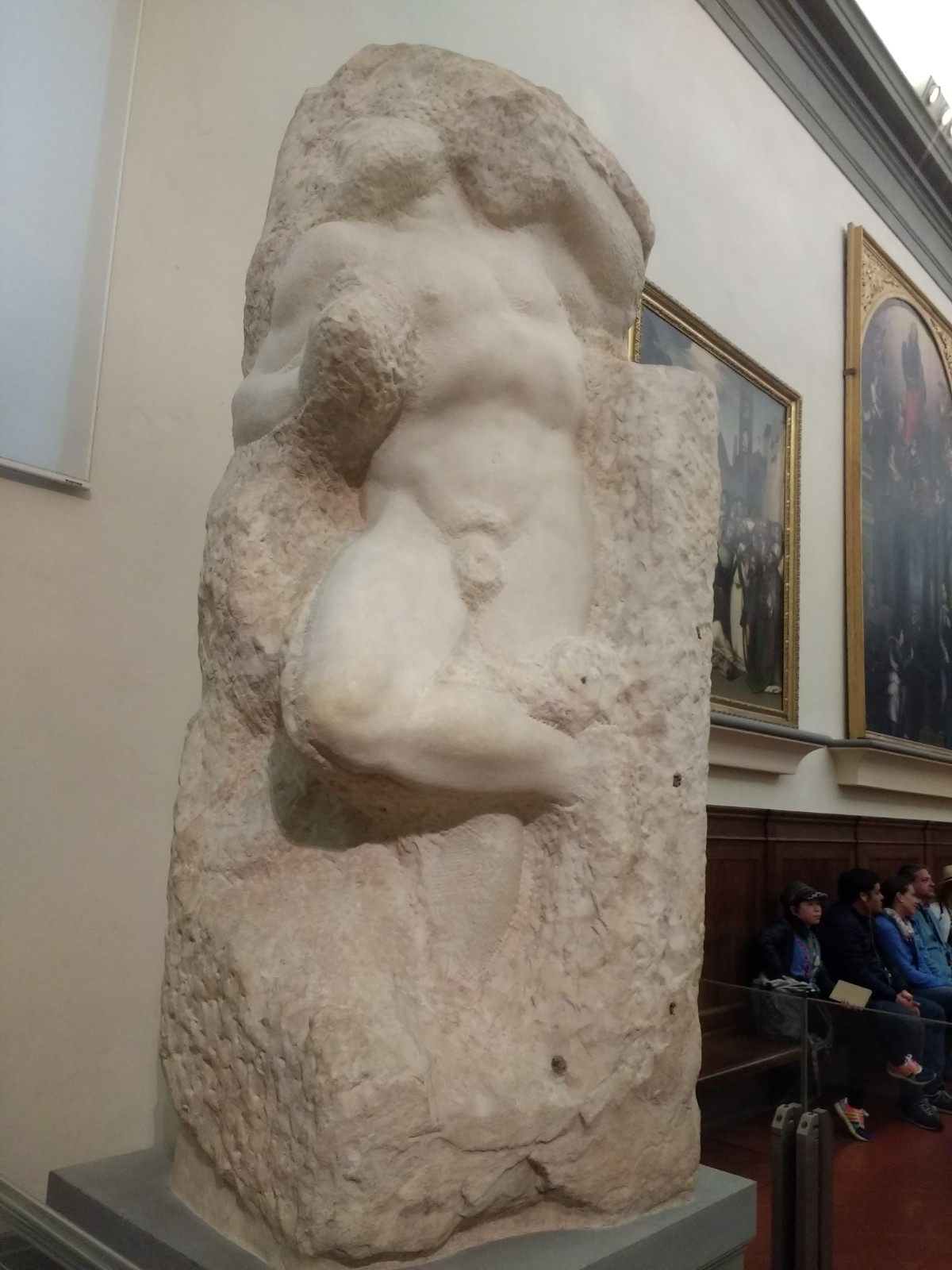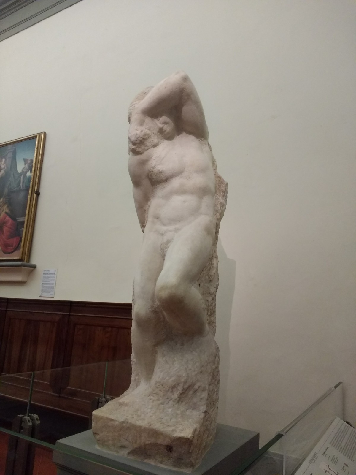 The ‘Prisoners’ were designed for the tomb of Pope Julius II (he who commissioned the ceiling for the Sistine Chapel) but someone must have come up with a different idea, and they were not wanted after all.