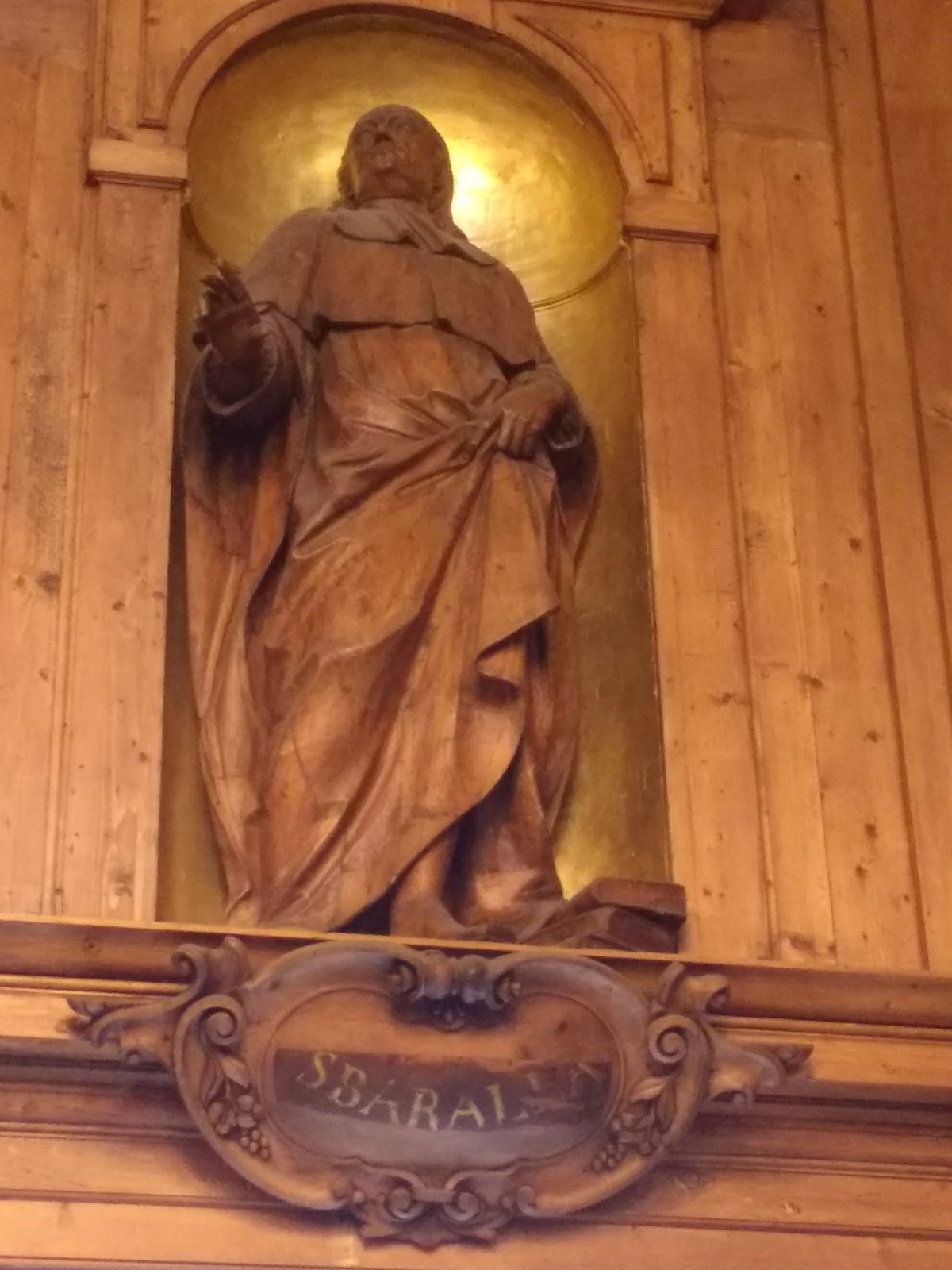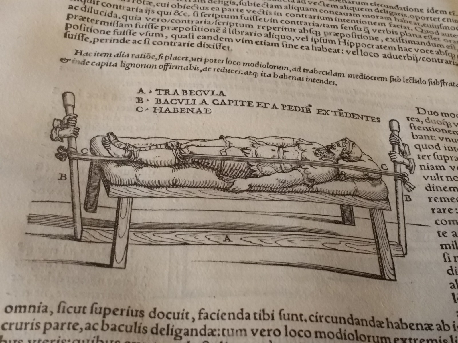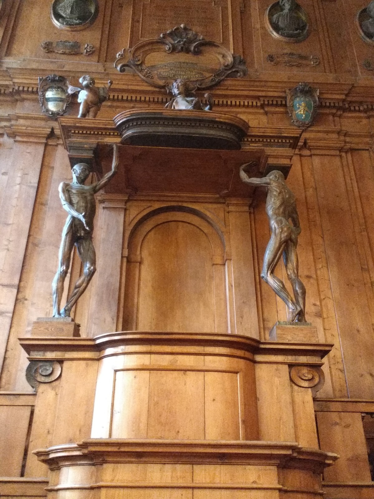The dissecting table in the middle of the theatre. The corpses were dissected by ‘demonstrators’.The lecturer taught from this rather magnificent ‘throne’. On either side of his chair are the ‘spellati’ (skinned) statues based on drawings by Ercolano Lelli, a famous wax modeller. The ceiling of the Anatomical Theatre This seventeenth century book was on display, showing the care of fractured limbs. The book was owned by Giovanni Girolamo Sbaraglia (1641-1710) professor of medicine at Bologna University.