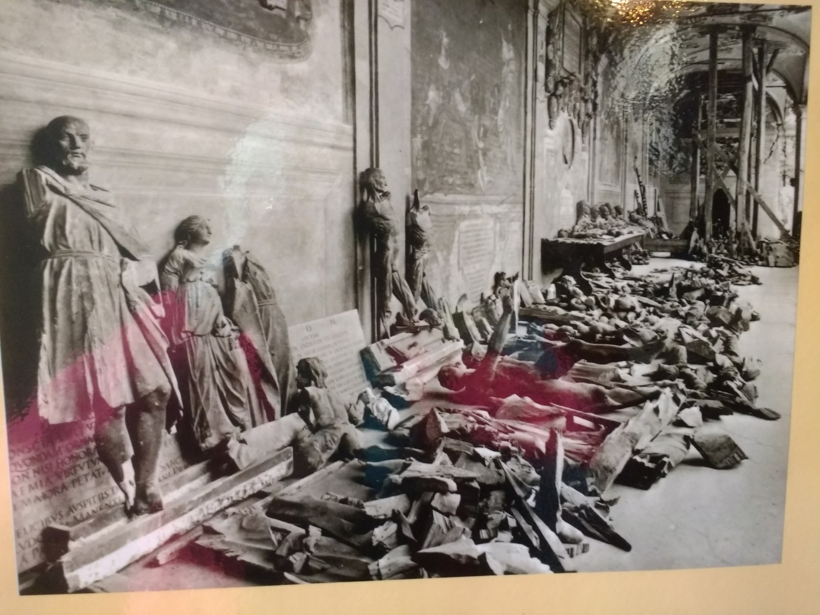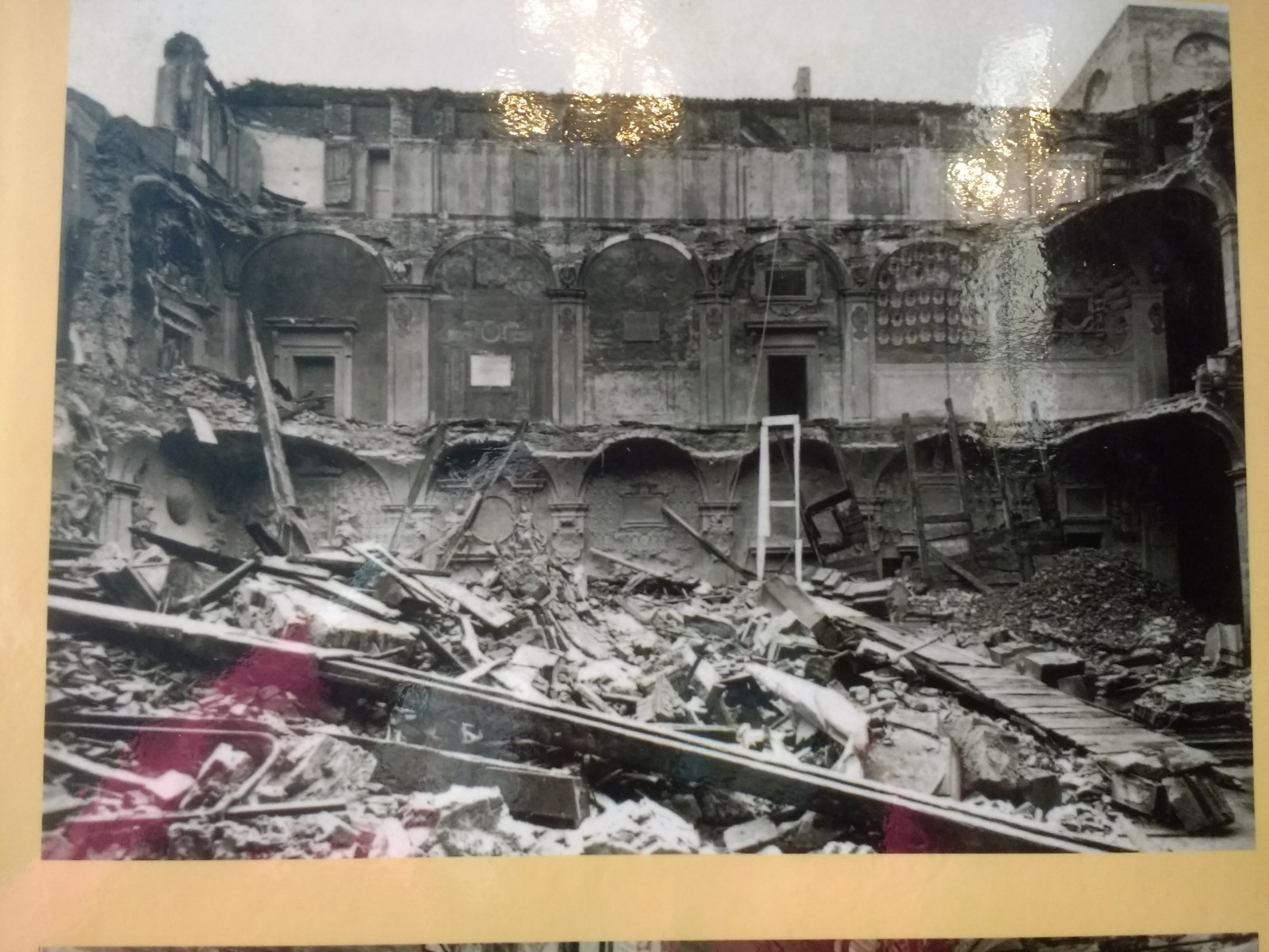 Damage after the air raid Incredibly, a number of statues survived and were used in the re-building.