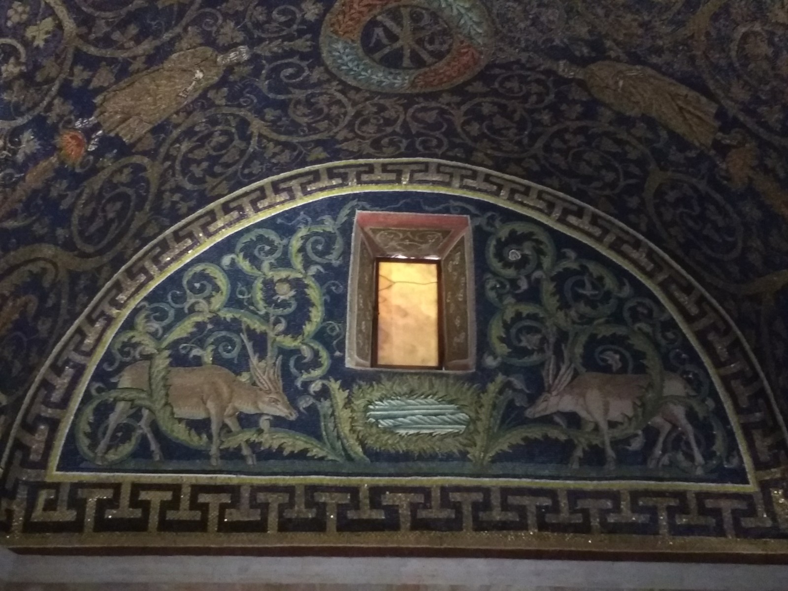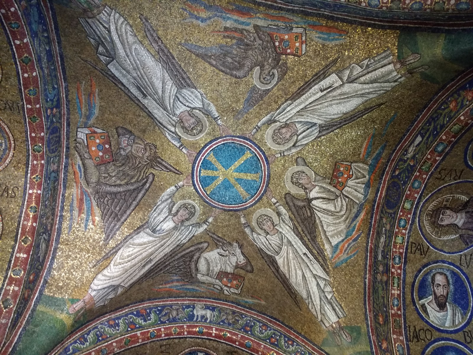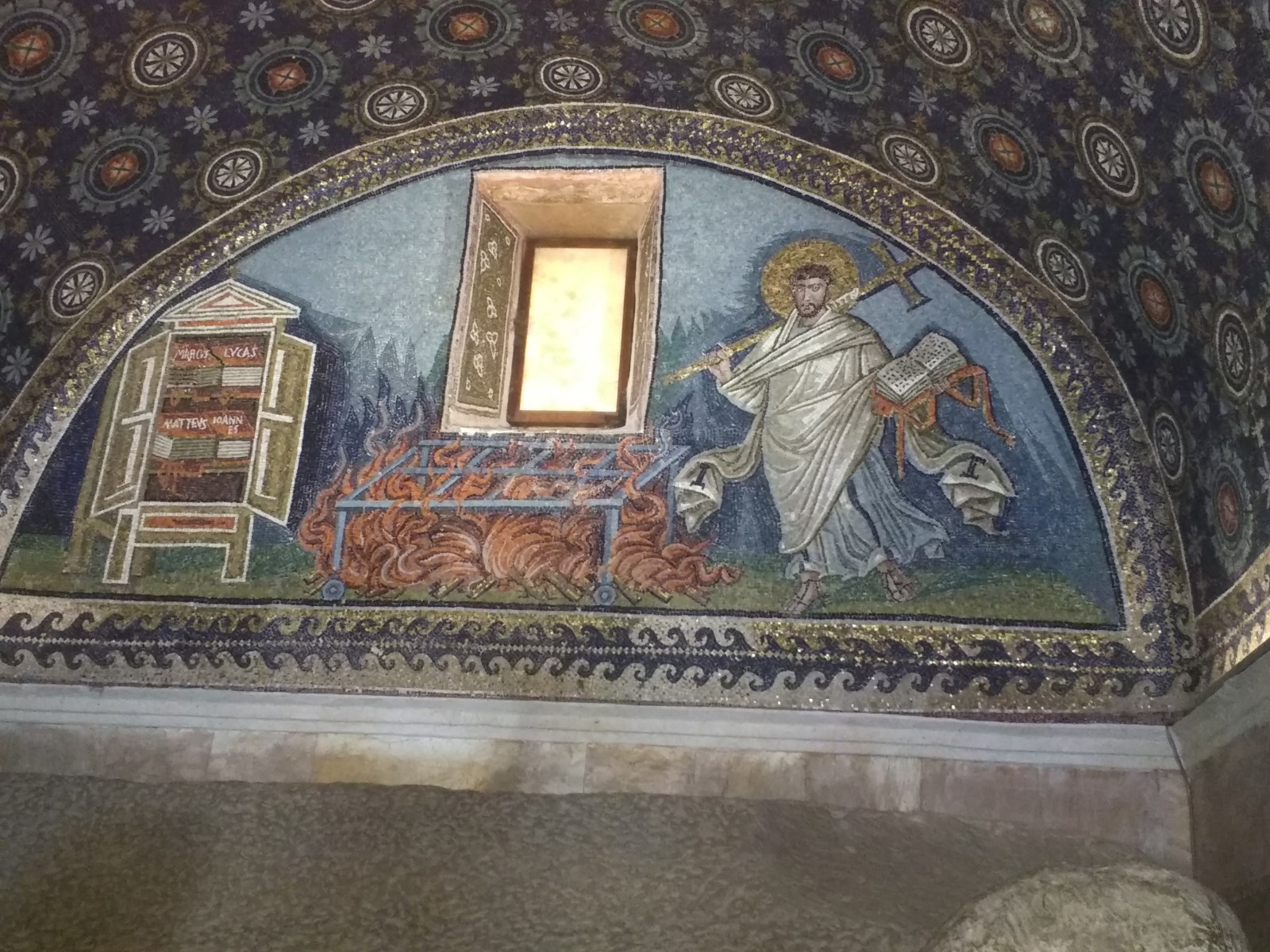 Mausoleum of Galla PlacidiaBeing a mausoleum, there have to be references to an afterlife. These are the four winged living beings, which, according to Revelations, announce the coming of the Saviour. From top left, going clockwise, they are the eagle, the man, the calf and the lion.St Lawrence (or San Lorenzo) walking towards his martyrdom. The legend goes that after lying on the bed of coals, Lawrence told his tormentors that one side was well done, and he should be turned over. Apparently, he is the patron saint of cooks and chefs. Was this decided by someone with a sense of humour?More mosaics, Mausoleum of Galla Placidia. The window is alabaster. Close-up of one of the beautiful alabaster windows