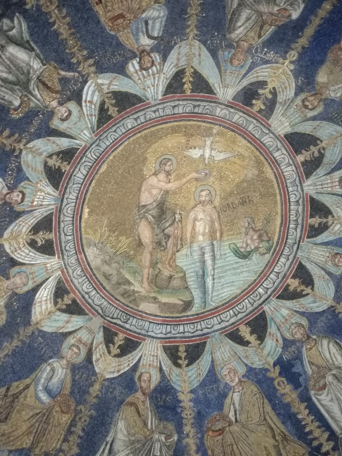 Baptismal bath for total immersion baptisms, Battistero Neoniano Ceiling, Battistero Neoniano In the centre of the ceiling is Christ’s baptism. The man on the right is a personification of the River Jordan