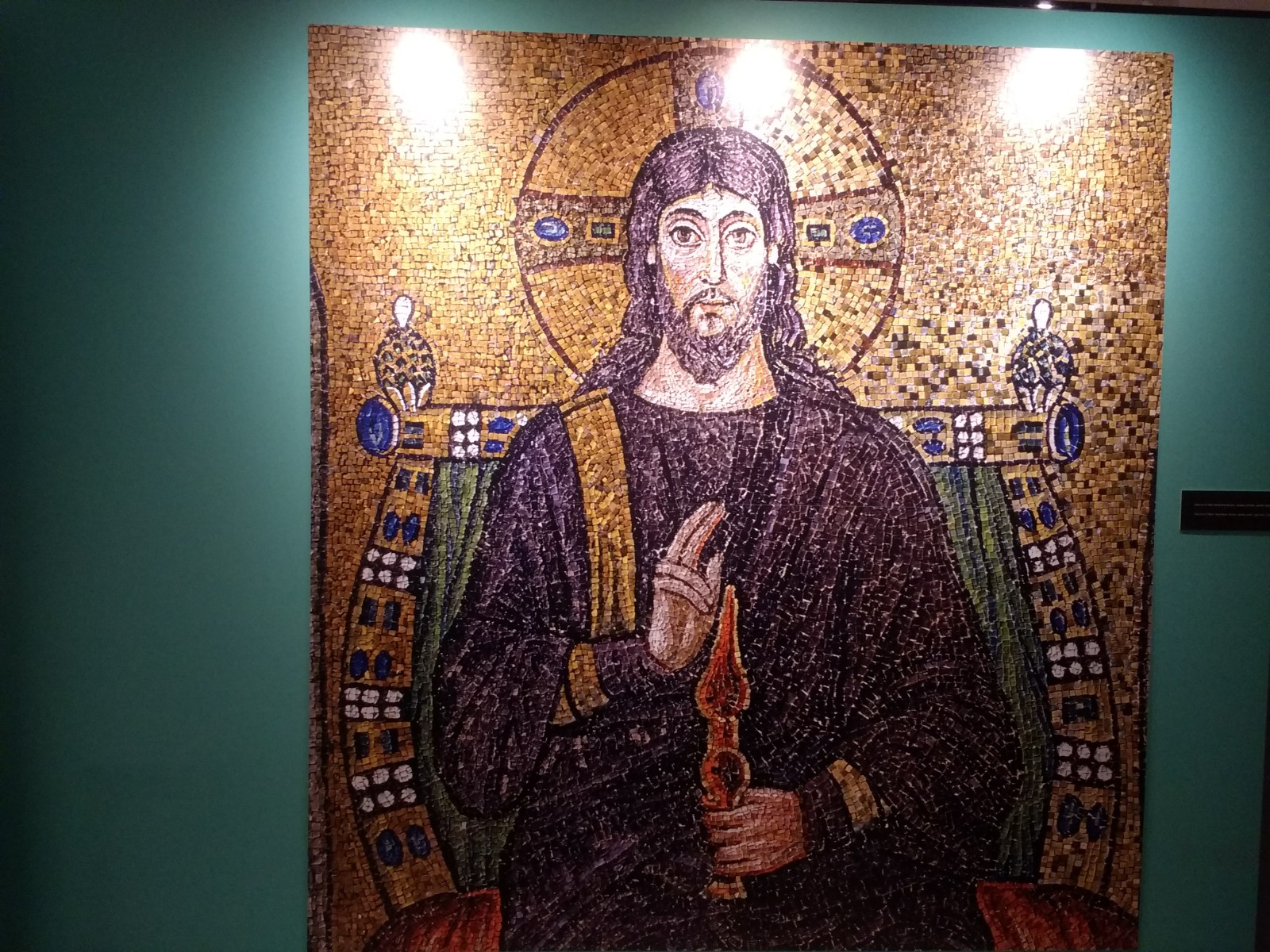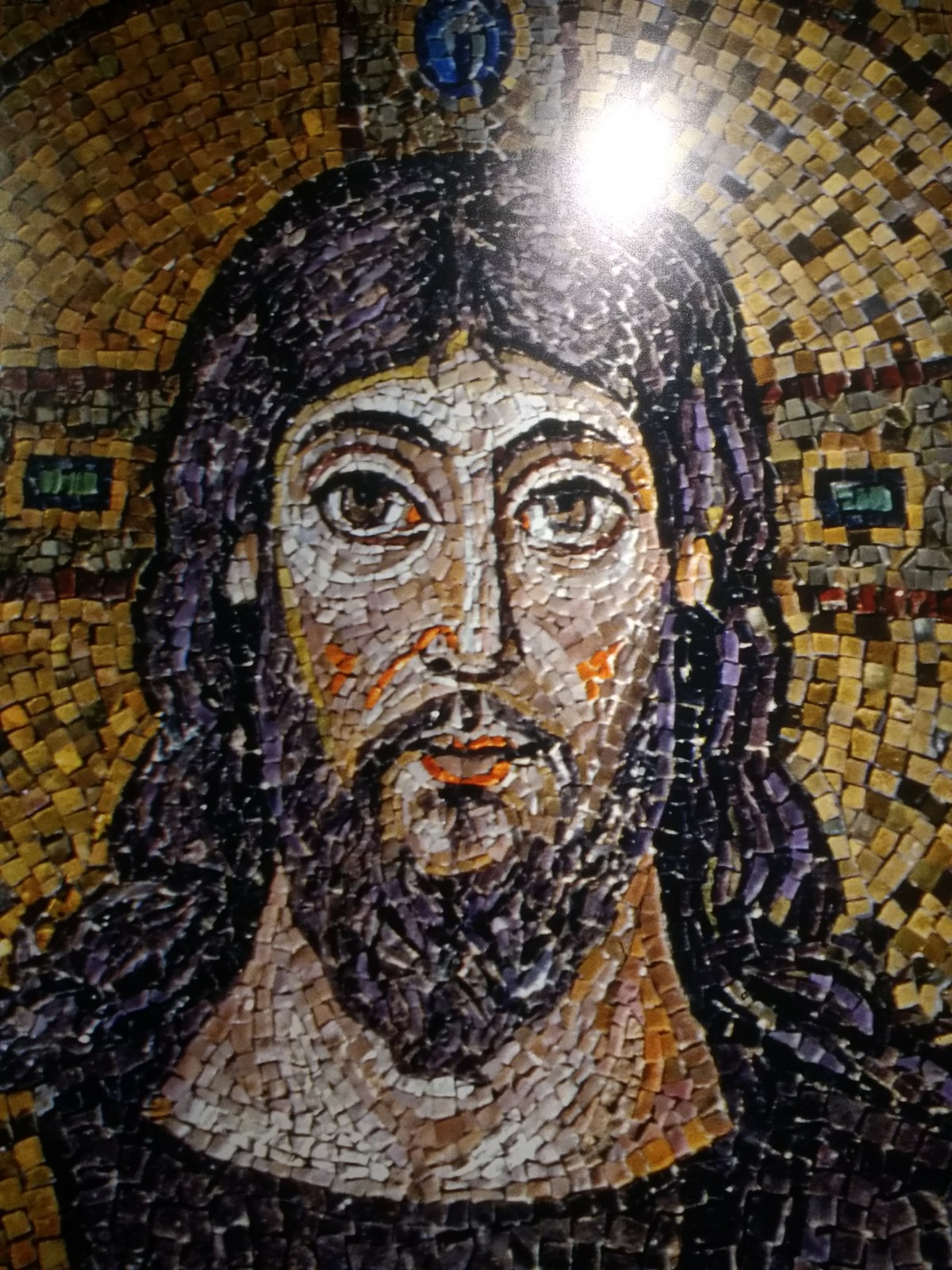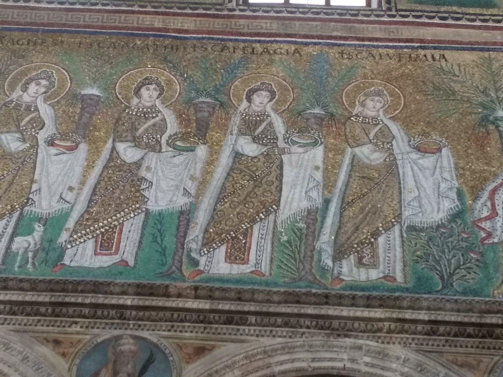 Christ, Sant’Apollinare. OK, this is a cheat. It’s a photograph of a photograph.When you look at the mosaic close-up, some of the colours look a little strange, like the orange pieces on Christ’s face, but looked at from a distance, it all works. It’s amazing how the mosaicists could work at close quarters on something that would be seen at a distance.Female Saints carrying holy relics, Sant’Apollinare