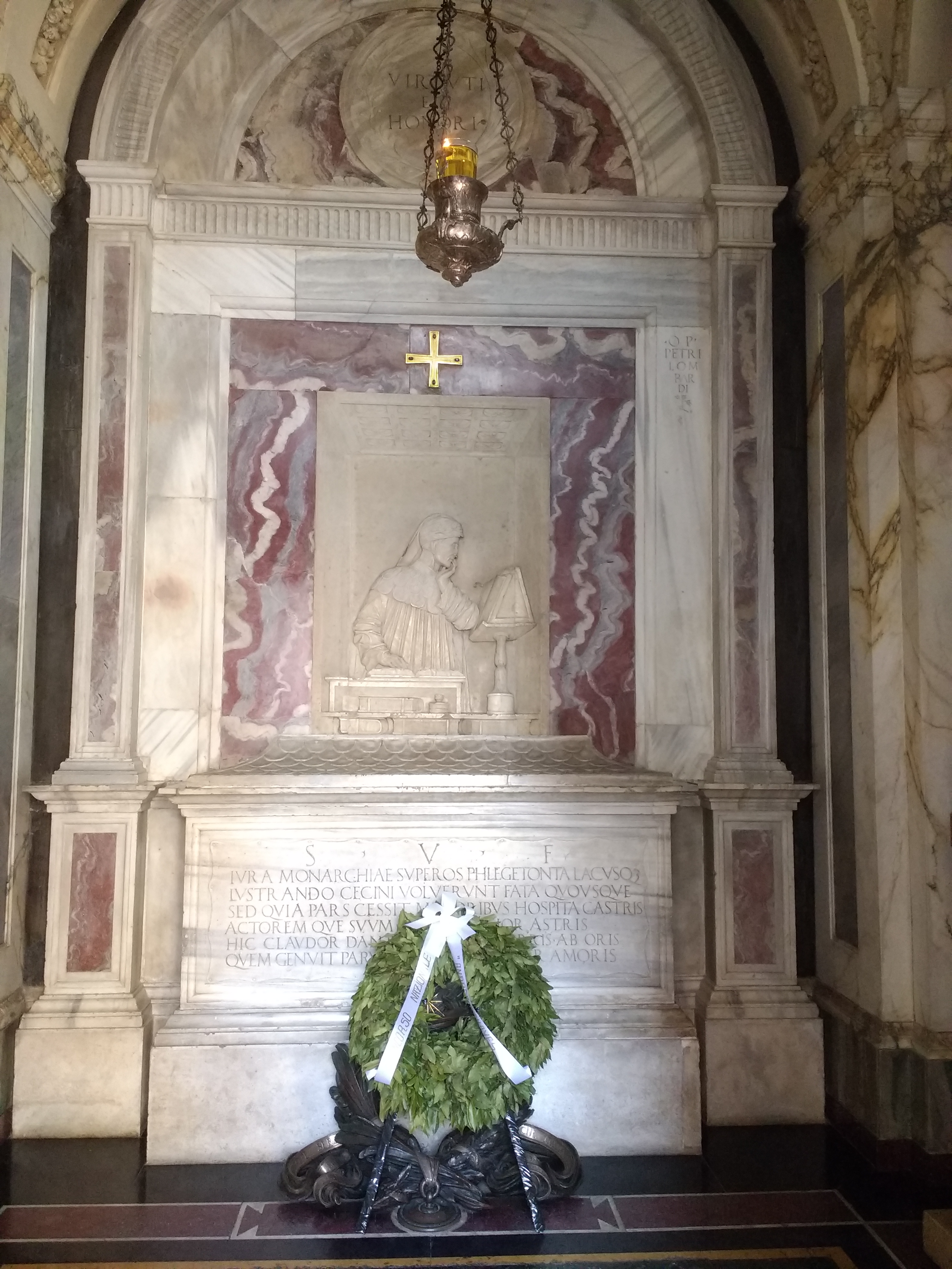 After exile from Florence, Dante made his way to Ravenna where he died in 1321. The lamp is fed by oil given by the city of Florence – to make amends possibly.