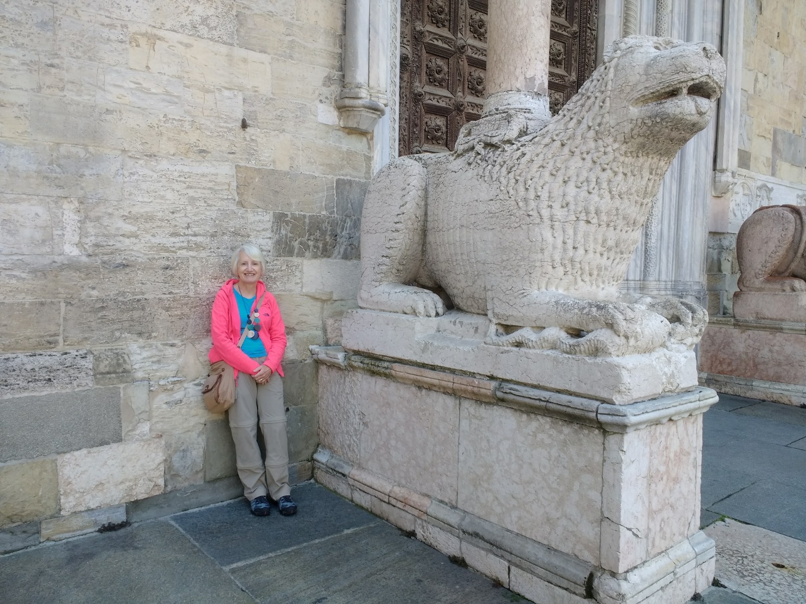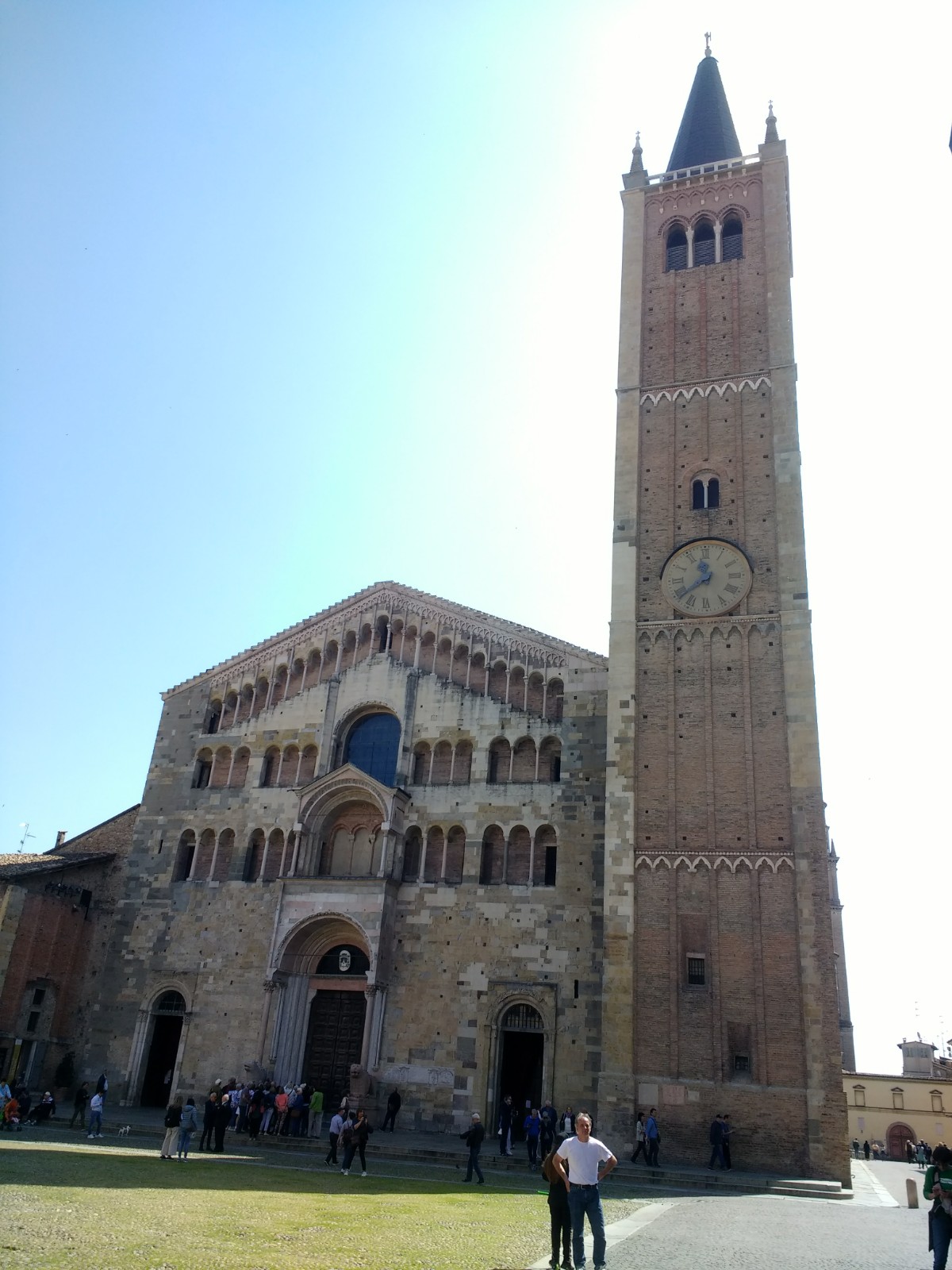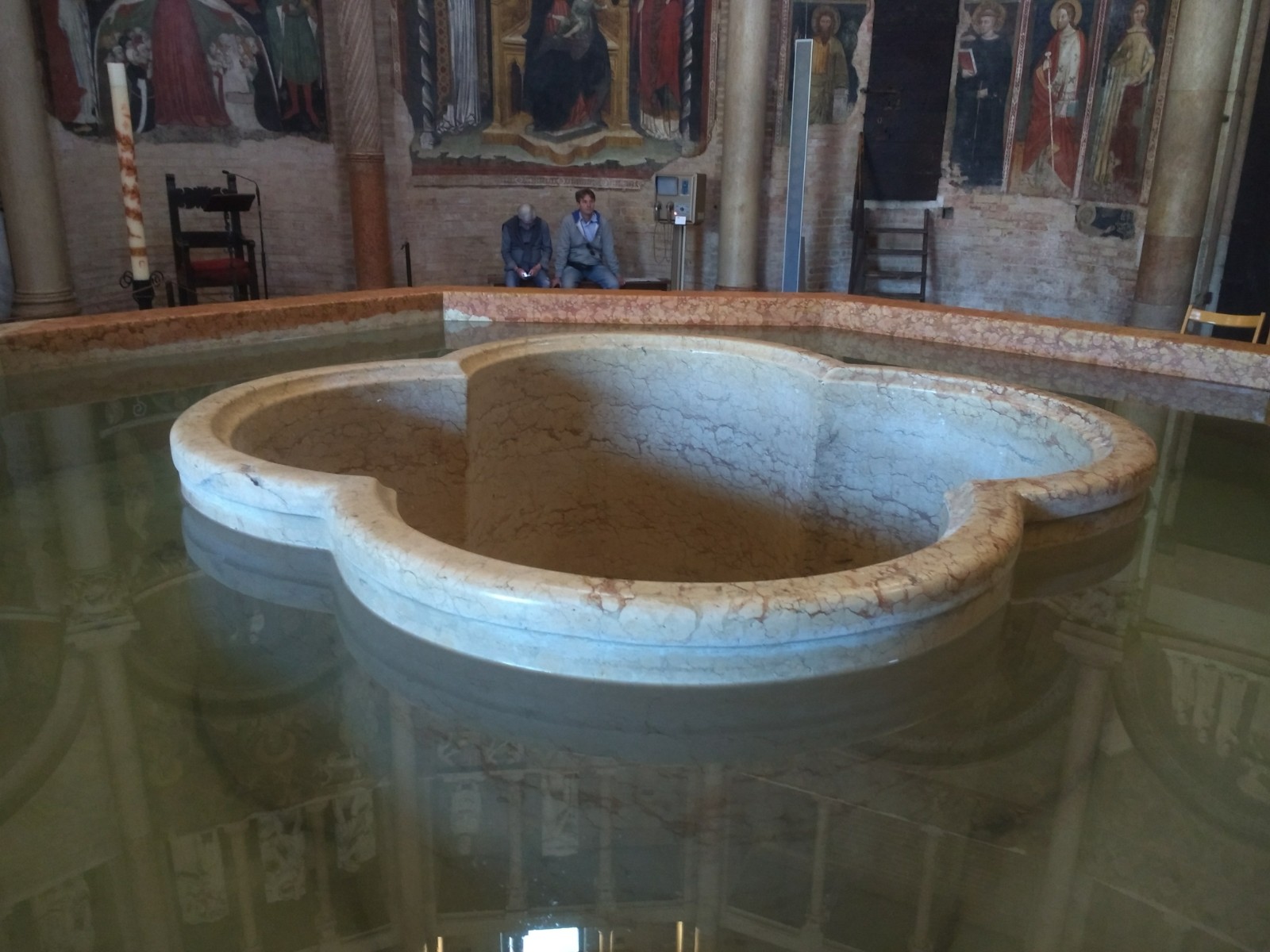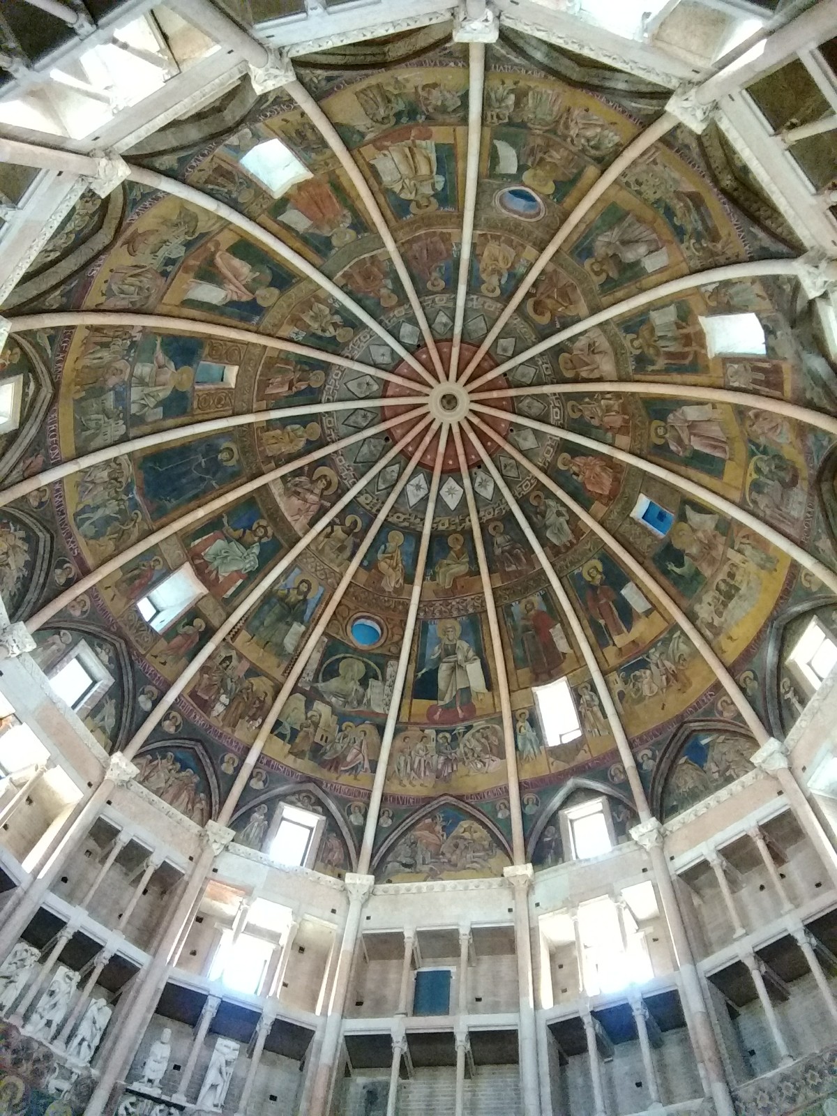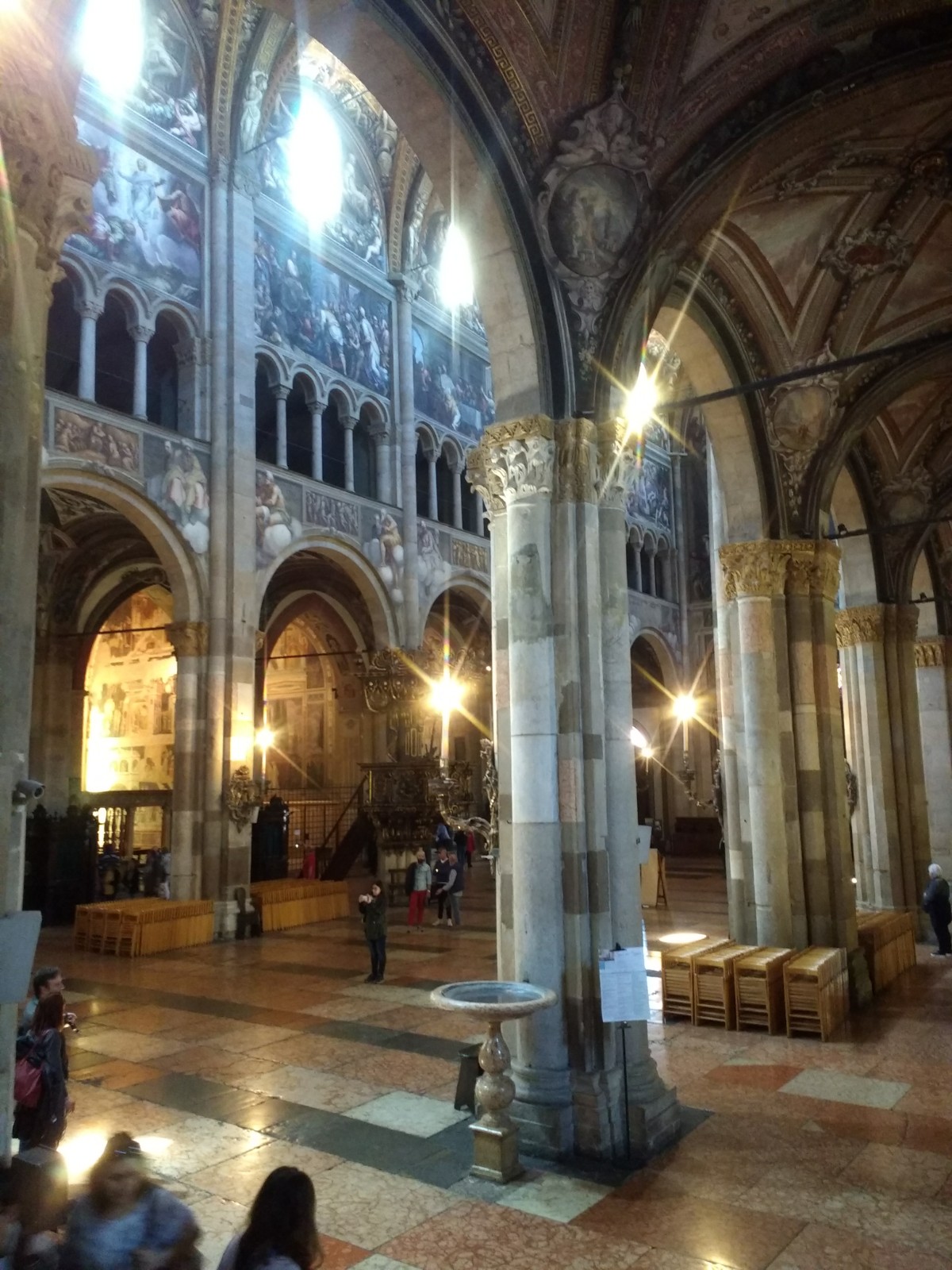 Parma Cathedral Inside the Cathedral The frescoes are mostly fifteenth century, and some are in monochrome.The guy on the left looks as though he is sharing a piece of gossip he has just come across.St Sebastian on the left being shot, and John the Baptist’s beheading on the right.This little trio of pictures looks like a cartoon and appears to tell a story, but I don’t know what it is.These men look as though they are in a communal bath.They’re either heating iron or cooking pizza.I loved this twelfth century carving. The angels look as if they’re crowd surfing.The roof of the Baptistery is having some work done to it at the moment.Carving on outside wall of BaptisteryInside the dome of the Baptistery, frescoed in the thirteenth century. The exterior of the building is octagonal, but inside there are sixteen sides.Double baptistery bath made from a solid block of beautiful two-tone marble from Verona. We estimated that the original slab would have measured 3.5 m x 3.5 m x 1 m. This is the reason it is called a ‘double’ baptismal bath. The priest would stand in the middle, keeping dry, but I am not sure how he got there, other than in a fairly ungainly manner.Me, outside the Cathedral