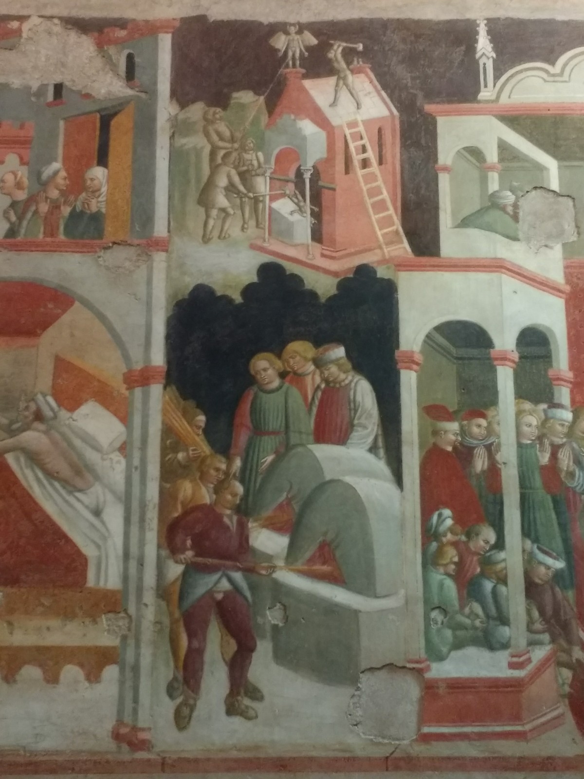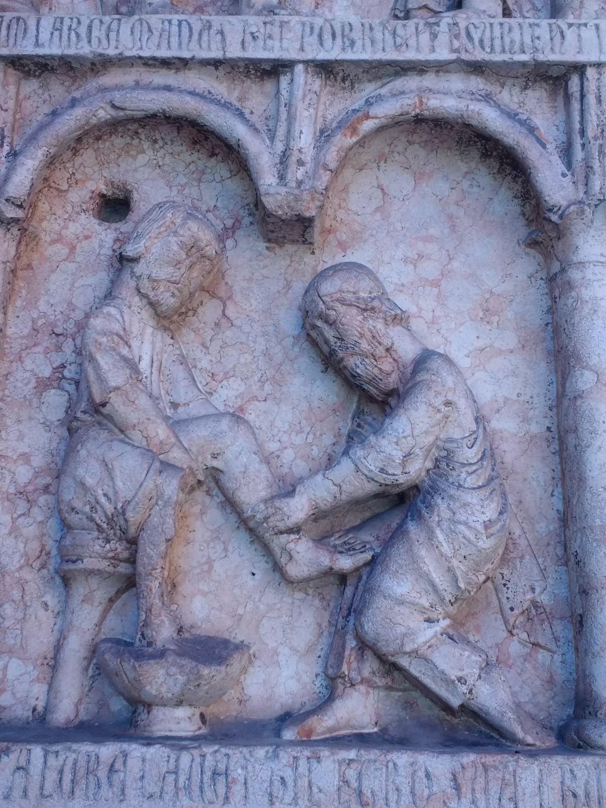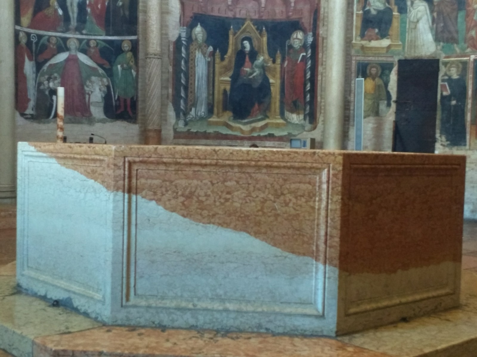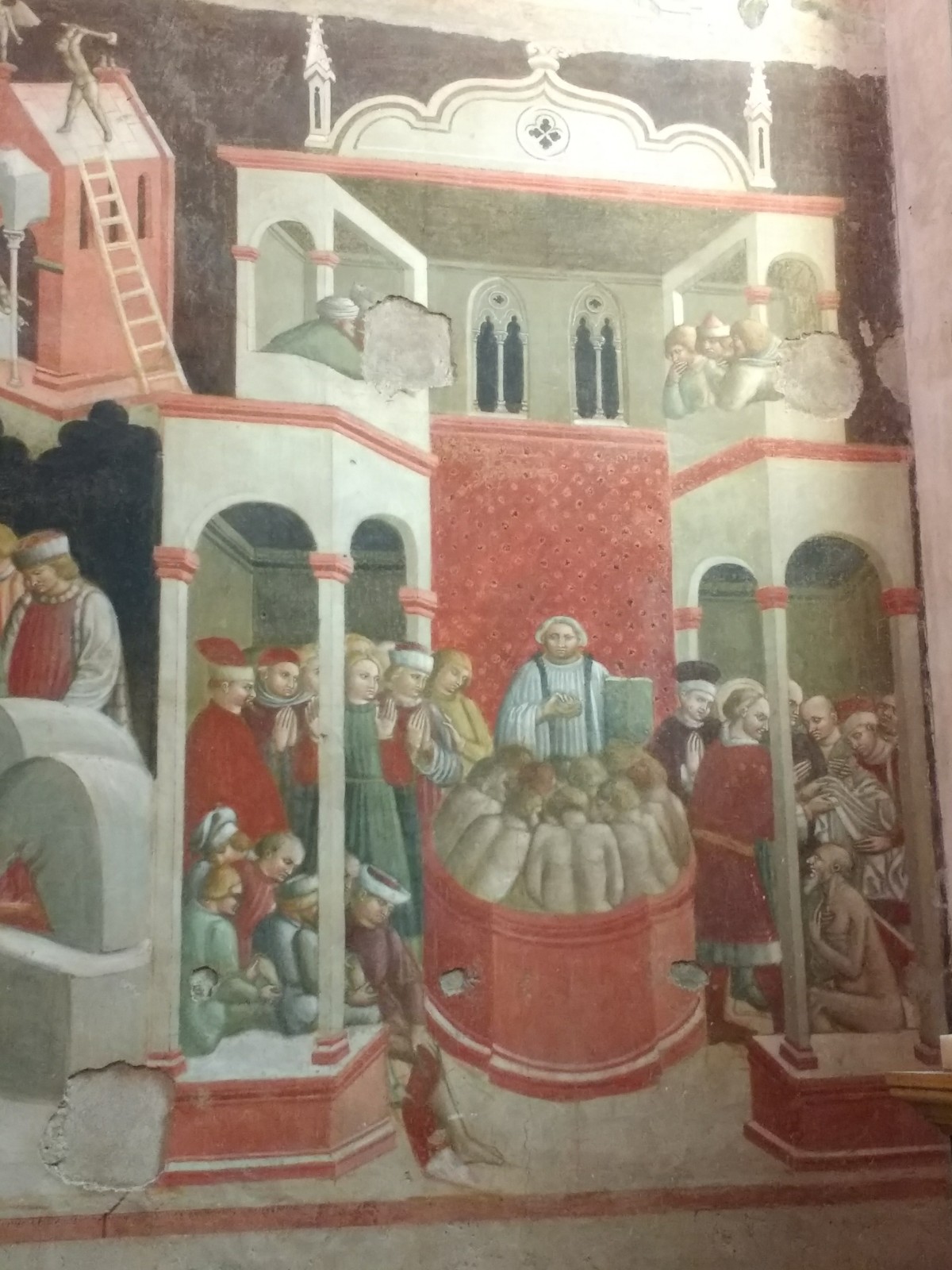 Parma Cathedral Inside the Cathedral The frescoes are mostly fifteenth century, and some are in monochrome.The guy on the left looks as though he is sharing a piece of gossip he has just come across.St Sebastian on the left being shot, and John the Baptist’s beheading on the right.This little trio of pictures looks like a cartoon and appears to tell a story, but I don’t know what it is.These men look as though they are in a communal bath.They’re either heating iron or cooking pizza.I loved this twelfth century carving. The angels look as if they’re crowd surfing.The roof of the Baptistery is having some work done to it at the moment.Carving on outside wall of BaptisteryInside the dome of the Baptistery, frescoed in the thirteenth century. The exterior of the building is octagonal, but inside there are sixteen sides.Double baptistery bath made from a solid block of beautiful two-tone marble from Verona. We estimated that the original slab would have measured 3.5 m x 3.5 m x 1 m. This is the reason it is called a ‘double’ baptismal bath. The priest would stand in the middle, keeping dry, but I am not sure how he got there, other than in a fairly ungainly manner.Me, outside the Cathedral