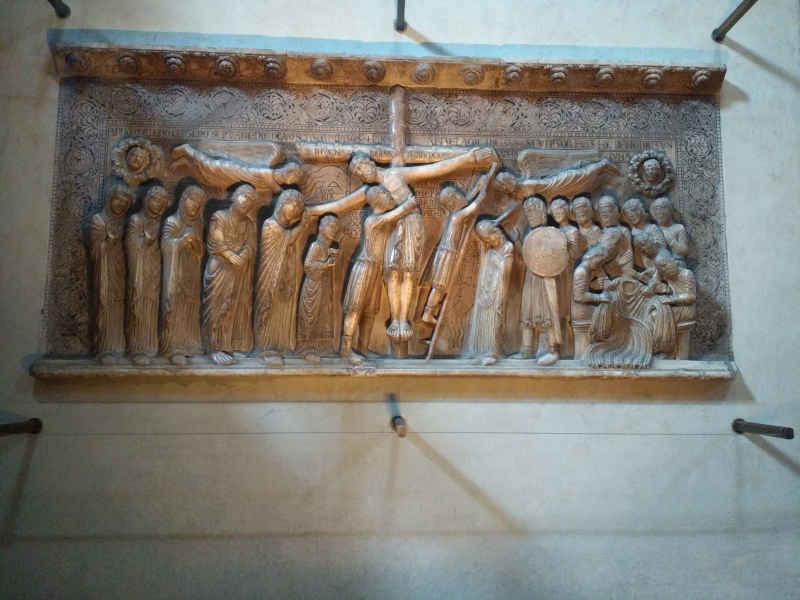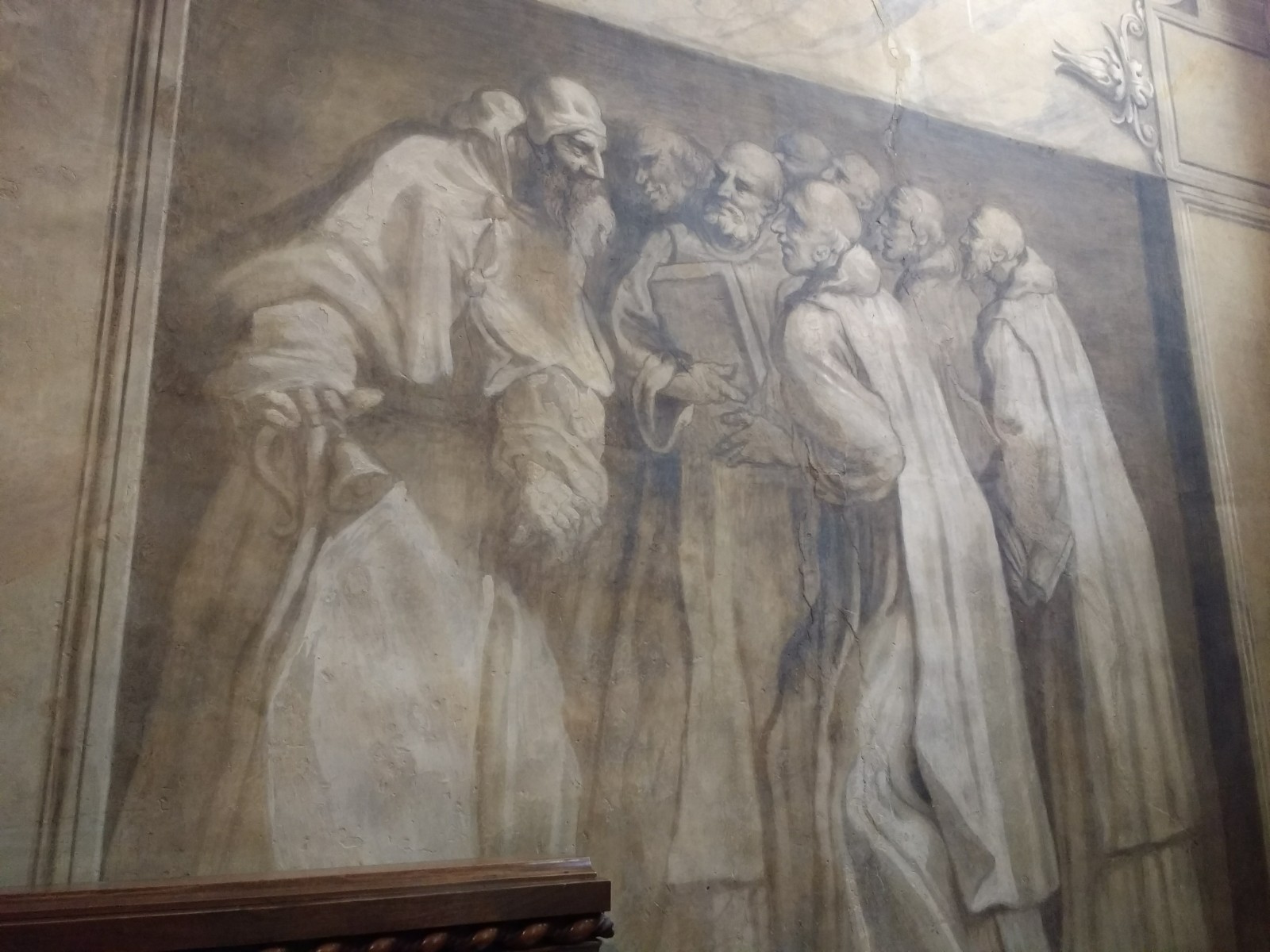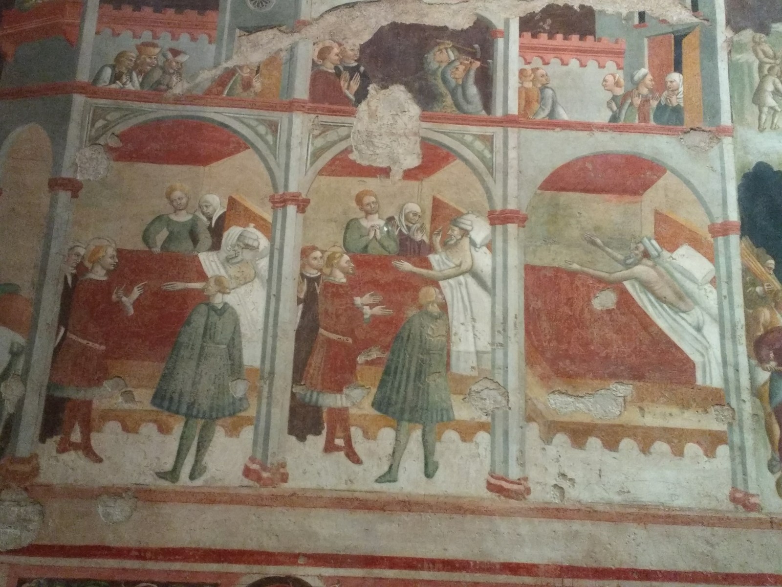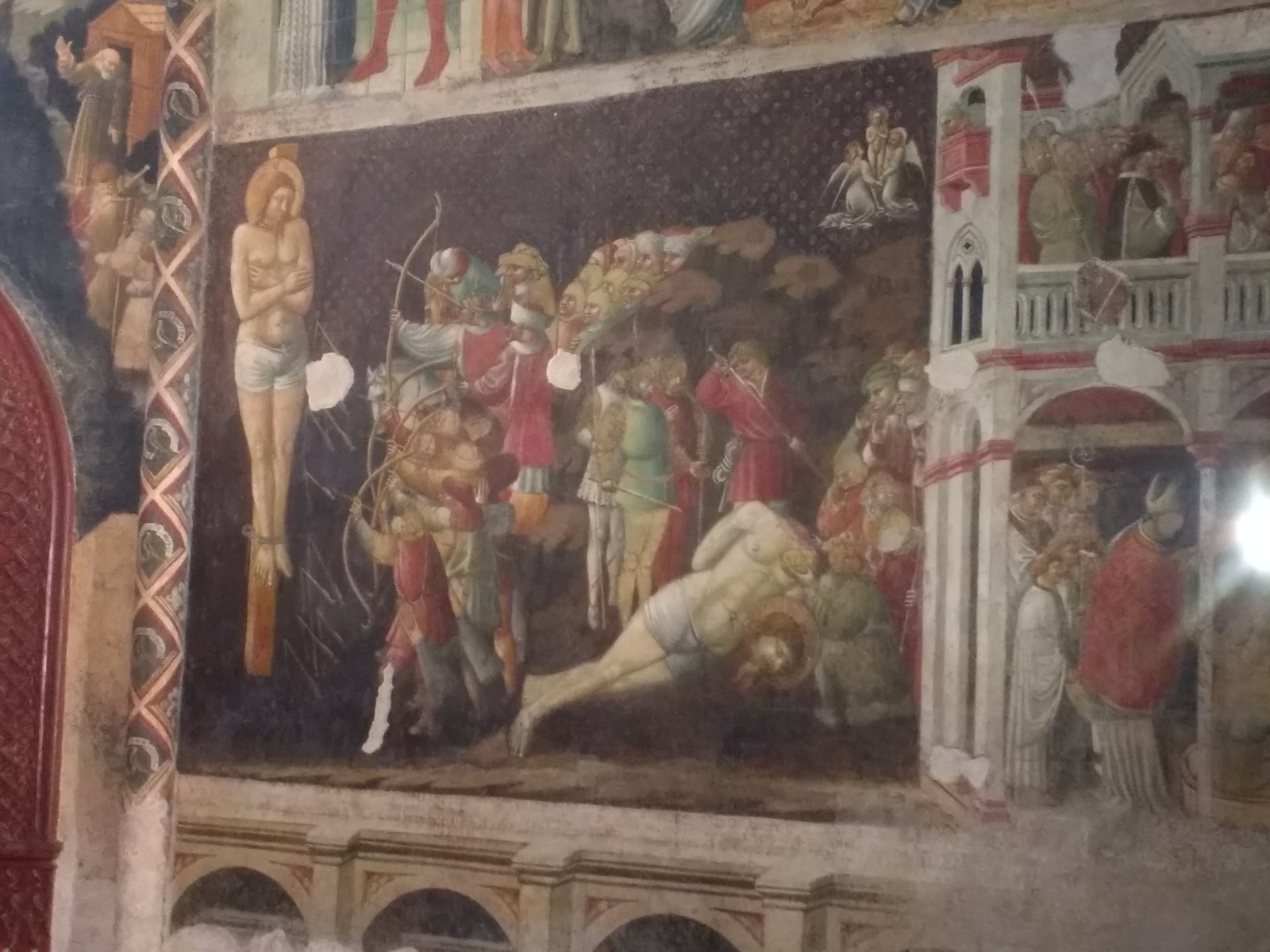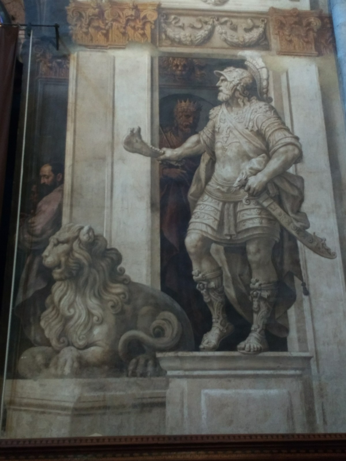 Parma Cathedral Inside the Cathedral The frescoes are mostly fifteenth century, and some are in monochrome.The guy on the left looks as though he is sharing a piece of gossip he has just come across.St Sebastian on the left being shot, and John the Baptist’s beheading on the right.This little trio of pictures looks like a cartoon and appears to tell a story, but I don’t know what it is.These men look as though they are in a communal bath.They’re either heating iron or cooking pizza.I loved this twelfth century carving. The angels look as if they’re crowd surfing.The roof of the Baptistery is having some work done to it at the moment.Carving on outside wall of BaptisteryInside the dome of the Baptistery, frescoed in the thirteenth century. The exterior of the building is octagonal, but inside there are sixteen sides.Double baptistery bath made from a solid block of beautiful two-tone marble from Verona. We estimated that the original slab would have measured 3.5 m x 3.5 m x 1 m. This is the reason it is called a ‘double’ baptismal bath. The priest would stand in the middle, keeping dry, but I am not sure how he got there, other than in a fairly ungainly manner.Me, outside the Cathedral