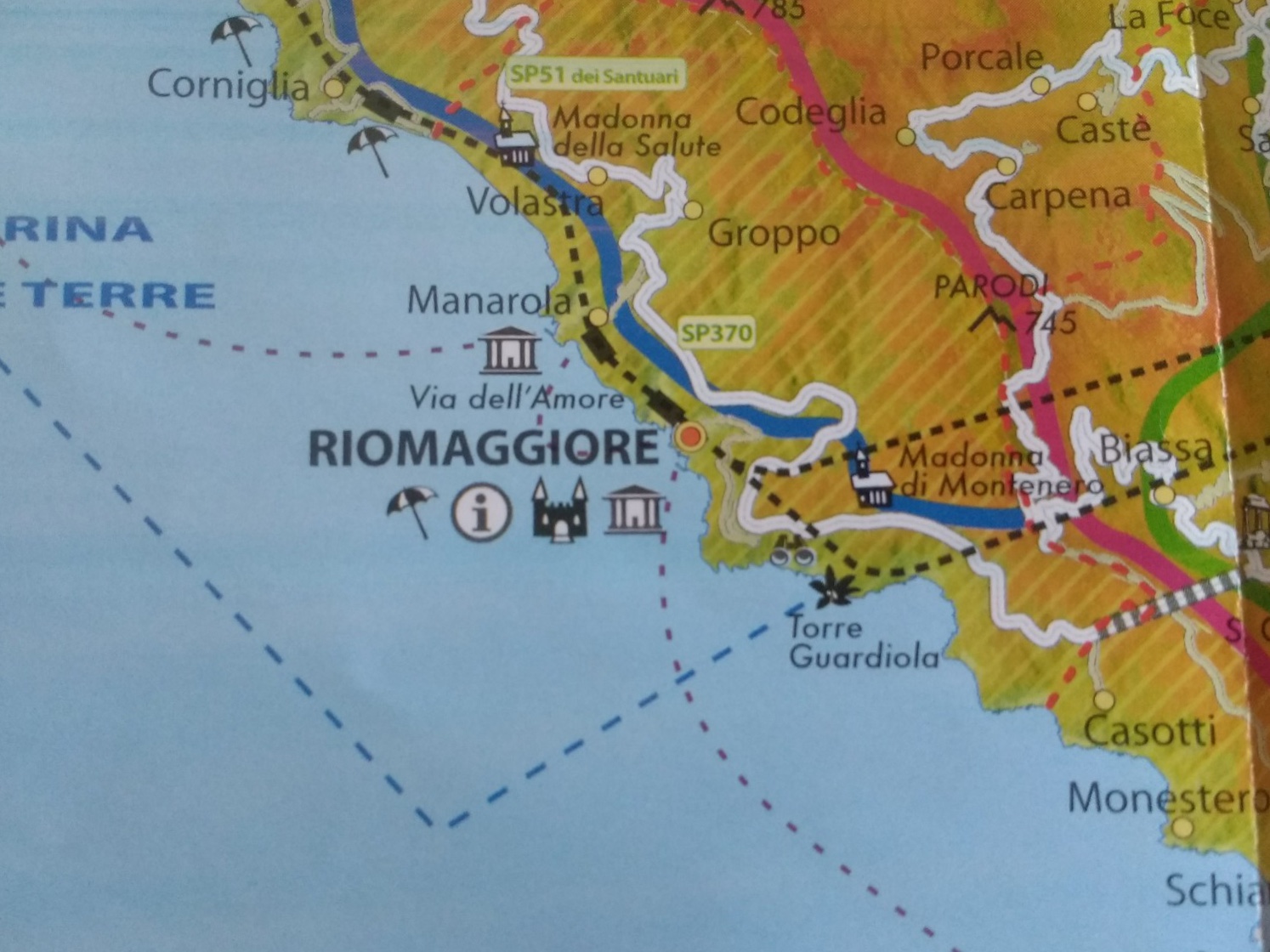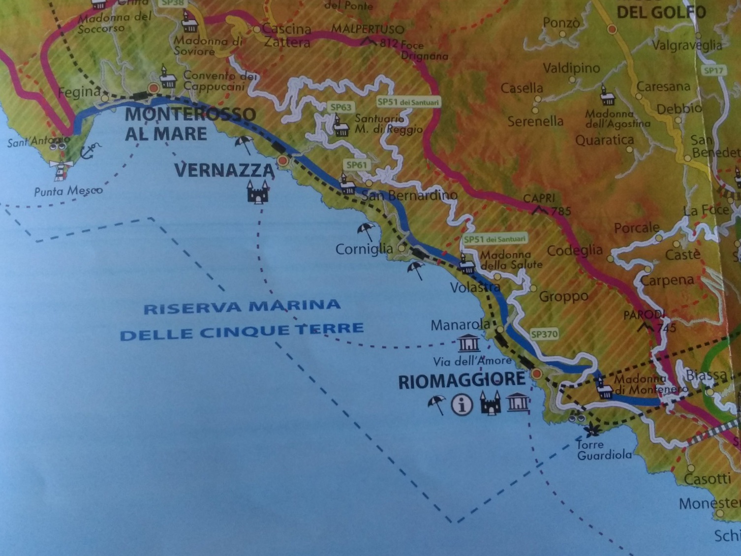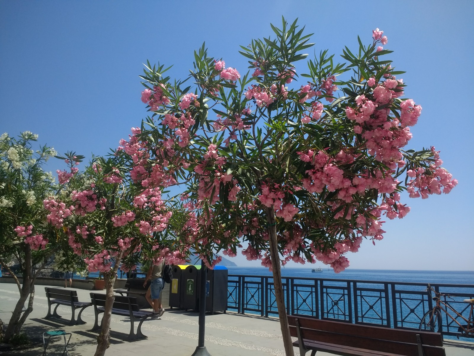 Above Manarola is the hamlet of Volastra, which we had a hot climb to the other day, on our way to the next village, Corniglia.You can sea Volastra on the map.We sailed right past Corniglia, as there is no quay.Vernazza Monterosso was the last stop on the outward leg, and the first time we got off the boat after La Spezia. It was the only one of the ‘Terre’ we had not visited before.Monterosso is the largest of the five settlements, and like a proper seaside town. I thought I wouldn’t like it for this reason, but it was charming. This is the new part with brightly-coloured umbrellas on the private beaches.The old part has a harbour.The oleander-lined promenade in the new part of Monterosso