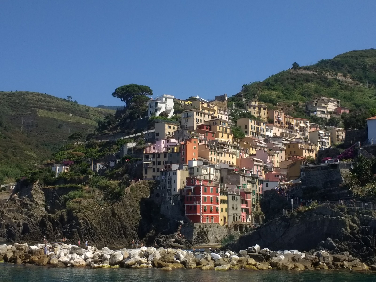 The first stop was Riomaggiore, I think the prettiest of the ‘Terre’ from the sea.The next village was Manarola. You can just see the figure of a man standing on the tiny quay.