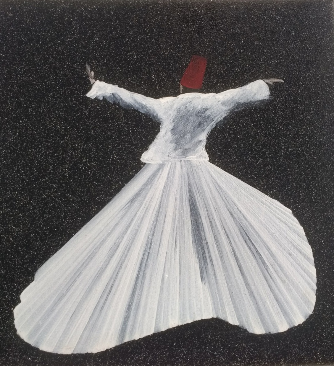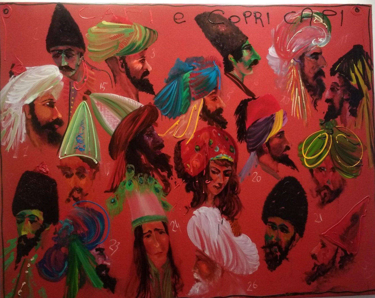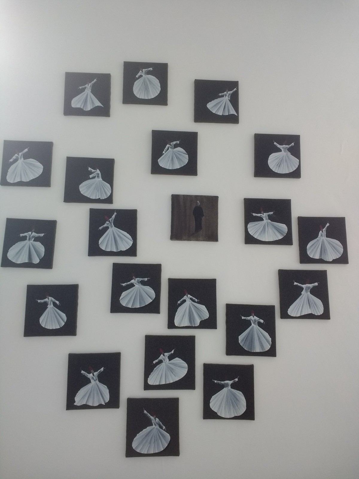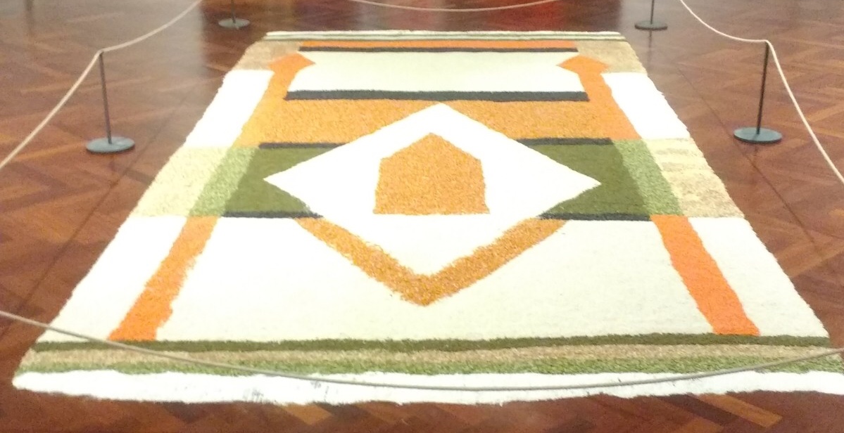 This series of pictures is simply called ‘Dervishes’ . The artist really conveys the movement in the dance.A closer view of three of the pictures. The brushstrokes are so light and so exact – no room for mistakes!‘Capi e Capricapi’ (Clothes and Hats)Mondino had a series of pieces inspired by carpets in the Middle East. This one, composed of seeds, must, we feel, have been stuck together, but we could see no evidence of this.Close up of the seed ‘carpet’I was less impressed with pictures he produced on squared paper. Mondino has repeated the same subject in the higher of the two pictures, but has not used the constraints of the squares.