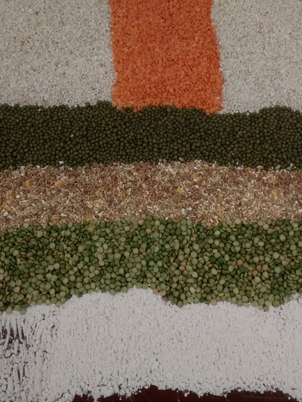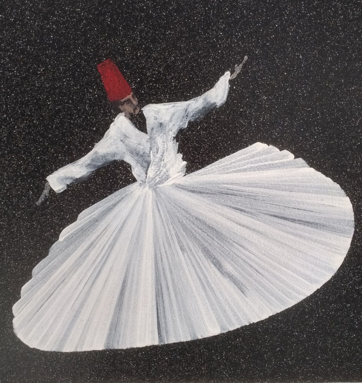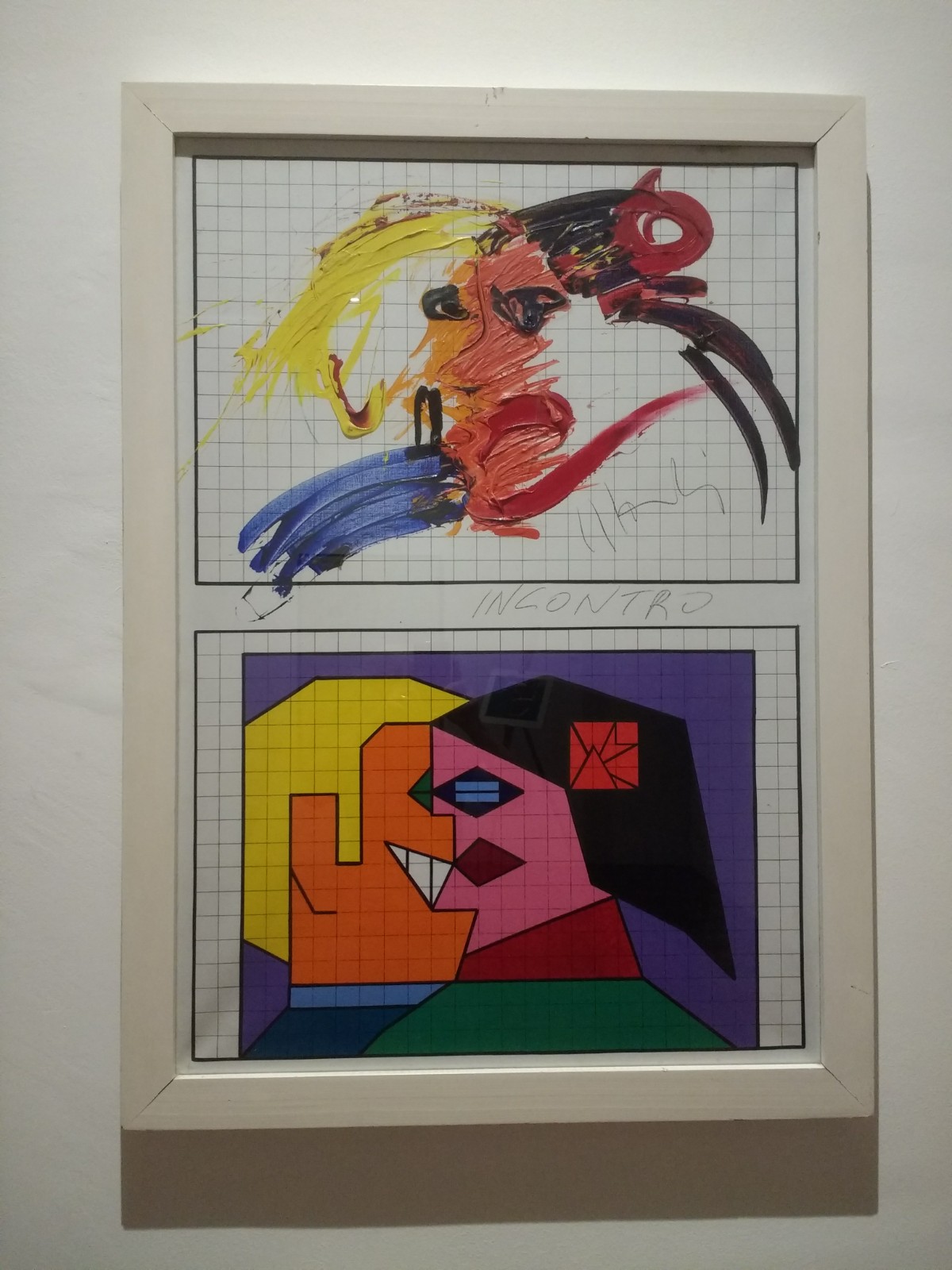 This series of pictures is simply called ‘Dervishes’ . The artist really conveys the movement in the dance.A closer view of three of the pictures. The brushstrokes are so light and so exact – no room for mistakes!‘Capi e Capricapi’ (Clothes and Hats)Mondino had a series of pieces inspired by carpets in the Middle East. This one, composed of seeds, must, we feel, have been stuck together, but we could see no evidence of this.Close up of the seed ‘carpet’I was less impressed with pictures he produced on squared paper. Mondino has repeated the same subject in the higher of the two pictures, but has not used the constraints of the squares.