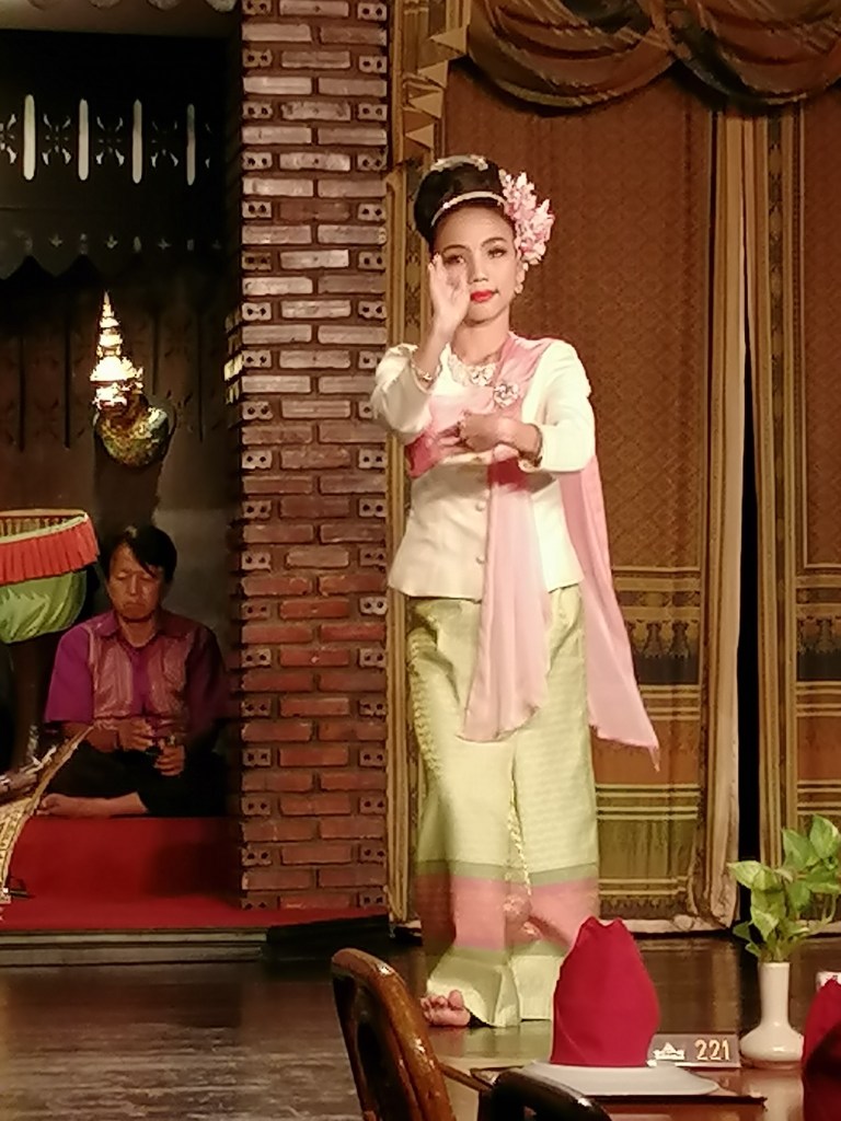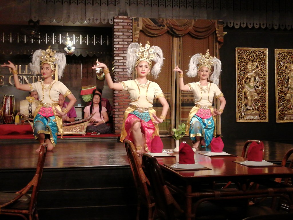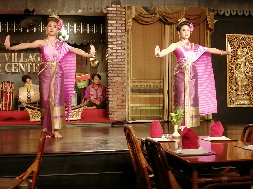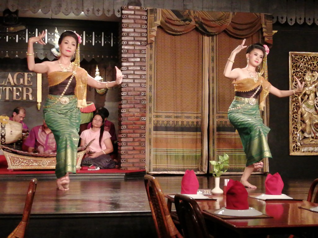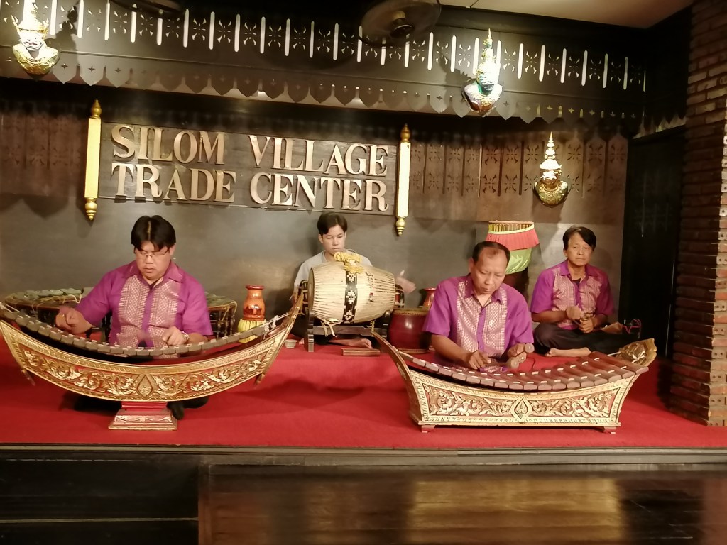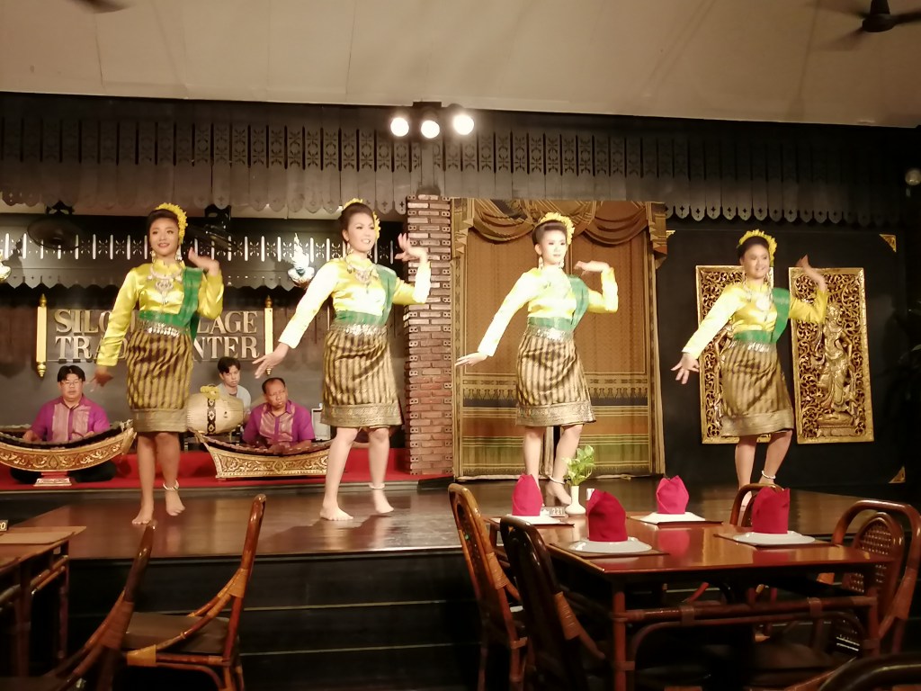 Silom Village is a restaurant in Bangkok where a small band of musicians play and heavily made-up and coiffed young women, wearing exquisite matching costumes, put on a wonderful display of traditional Thai dance while you eat your meal.