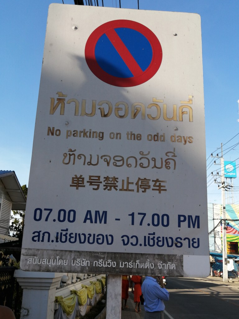 Subtleties, like the difference between ‘the odd days’ and ‘odd days’ must make English tricky for foreign learners, but today being 1 November and an ‘odd day’, everyone was dutifully parked on the opposite side of the road. In Thailand you drive on the left (or ‘correct’) side of the road.